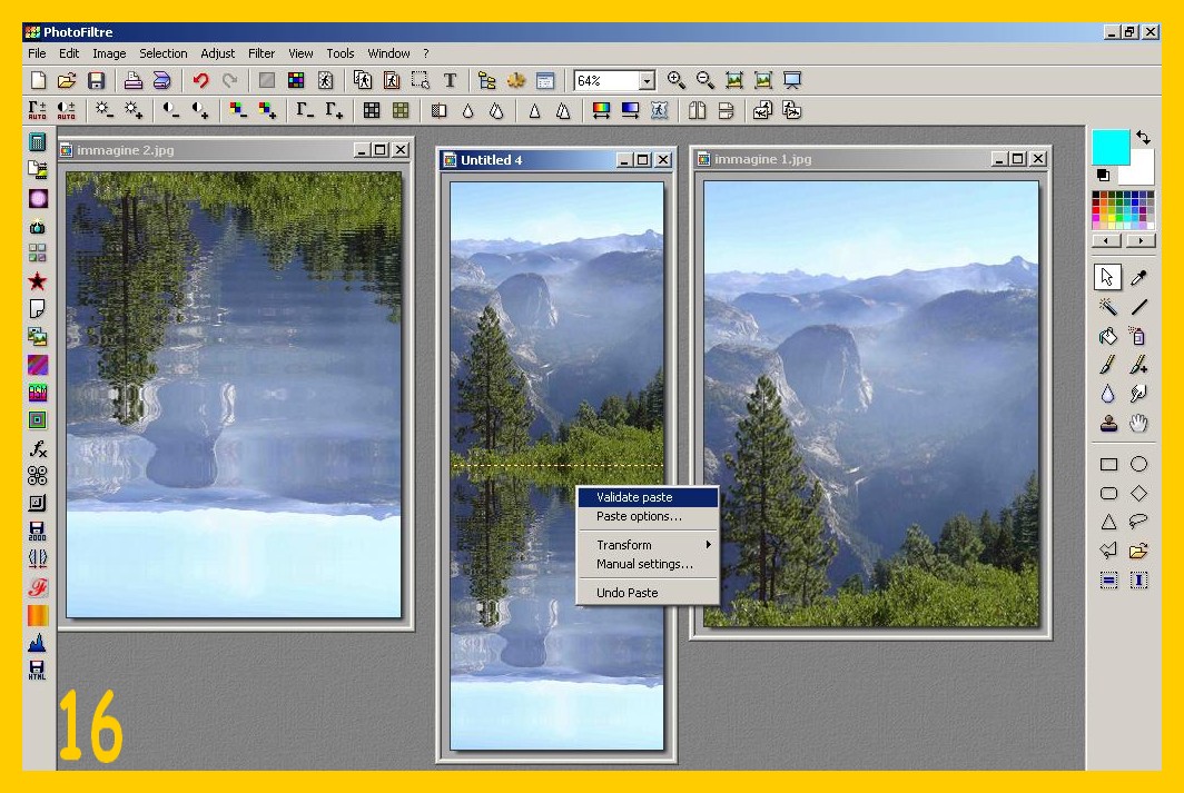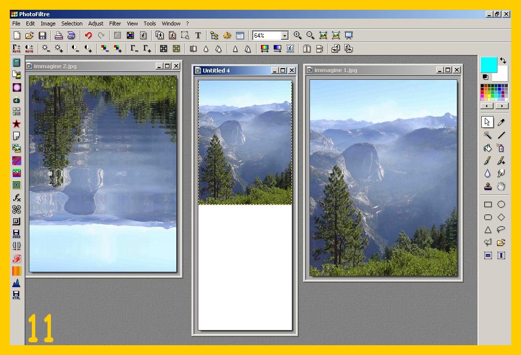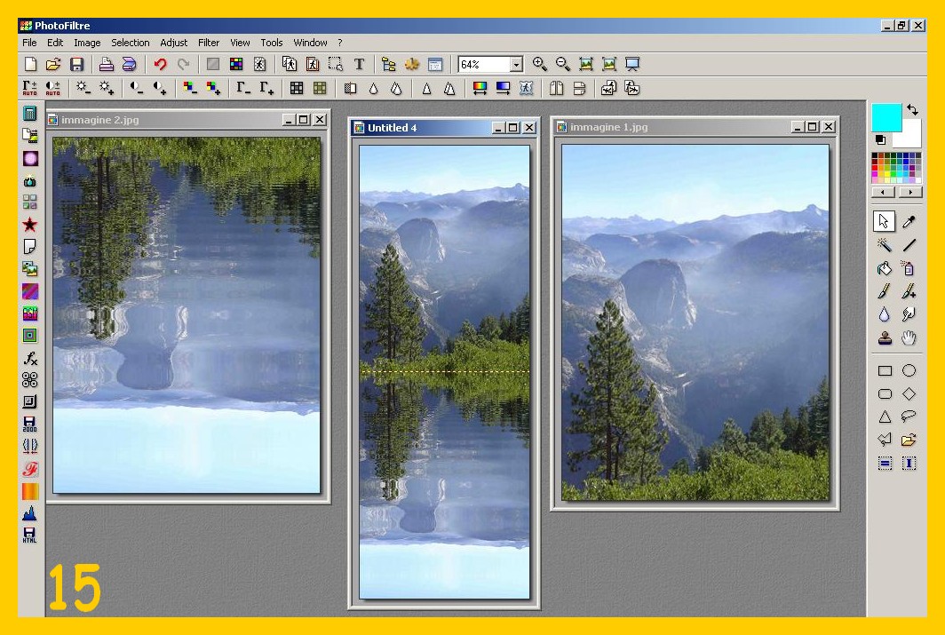 In tutte le nostre Gallery, in particolare nella 4 e 5, potrete vedere altri esempi di riflessi nell’acqua ed altri tutorials nell’ELENCO TUTORIALS. E ricordate…. per ogni dubbio guardate in TUTORIALS PER CASO. Nell’introduzione e sotto l’elenco dei tutorials trovate tante spiegazioni utili per usare al meglio Photofiltre, così come il modo di scaricare e installare plugins, unfreez, caratteri nuovi e tante altre cose che vi possono aiutare per la realizzazione dei tutorials….