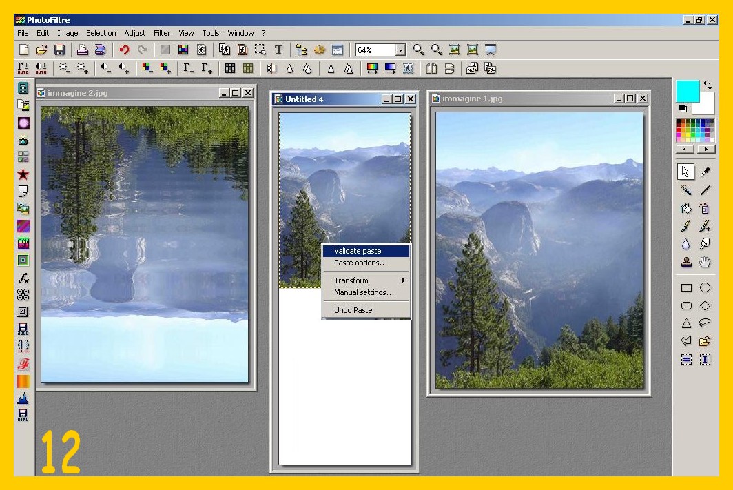 11. Quando la vostra immagine sarà sistemata bene nella parte superiore convalidate: con la freccia nella selezione cliccate con la parte destra del vostro mouse. Vi apparirà una finestra piccolissima. Lì dovete cliccare per confermare su Convalida ed Incolla (VALIDATE PASTE) (imm.12) ![]()