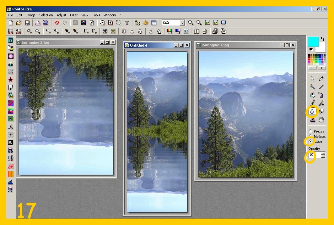 17. La vostra immagine con riflesso nell’acqua è finita. Non rimane che, servendosi dello strumento nella barra a destra che serve per sfocare (quello a forma di goccia cerchiato in giallo nell’immagine 17), mettendo OPACITA 10 e spuntando su LARGO sotto (imm. 17)