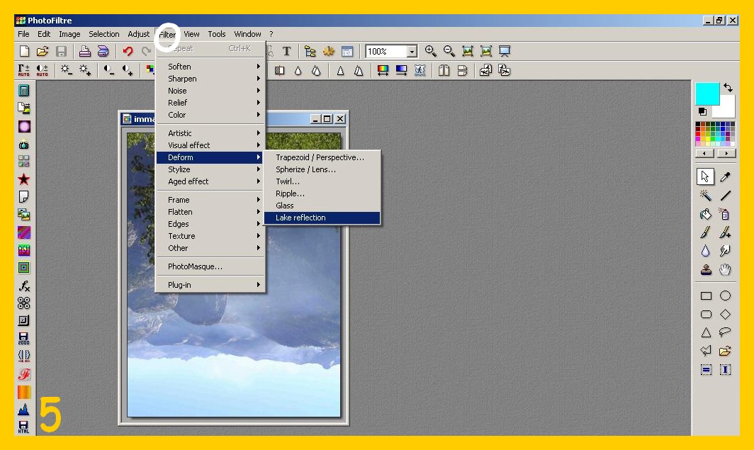5. Ora dobbiamo creare l’effetto riflesso nell’acqua, perciò cliccate in Filtro – Deformazione e, nel successivo menù a discesa, in Riflessi acqua (FILTER – DEFORM – LAKE REFLECTION) (imm.5) ![]()