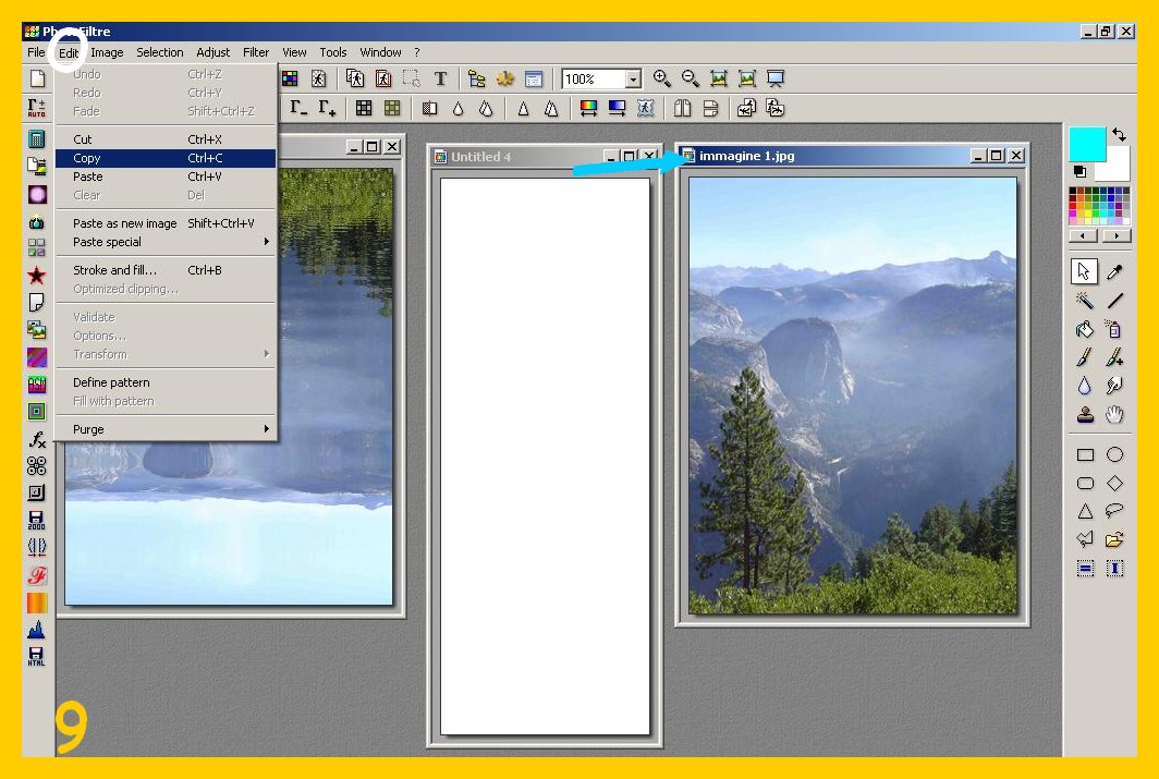 8. Tornate alla vostra prima immagine e toccatela con la freccia perché diventi attiva. Lo noterete perché sopra diventa azzurra come indicato dalla freccia nell’immagine 9. Dovete ora cliccare su Modifica e Copia (EDIT – COPY) (imm. 9) ![]()