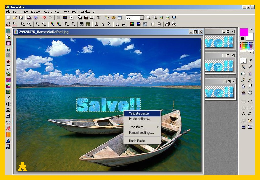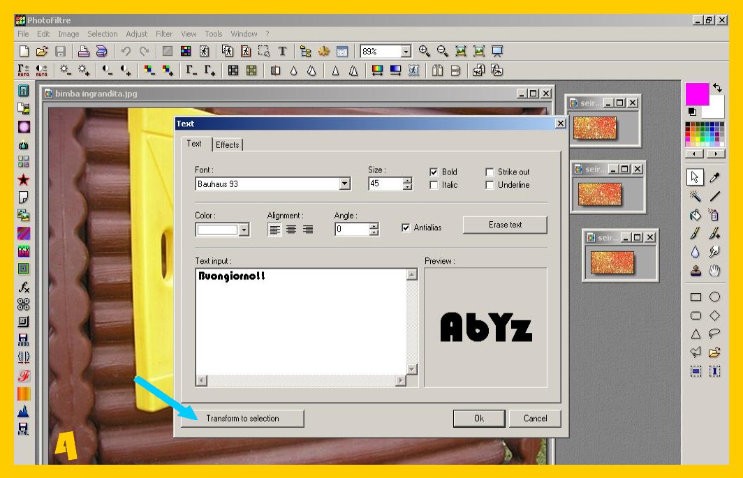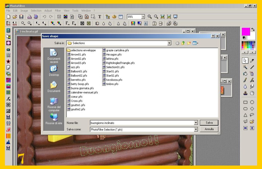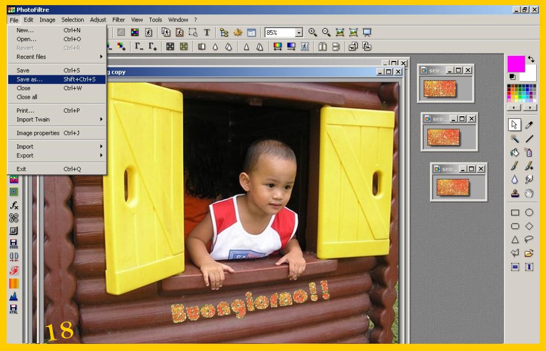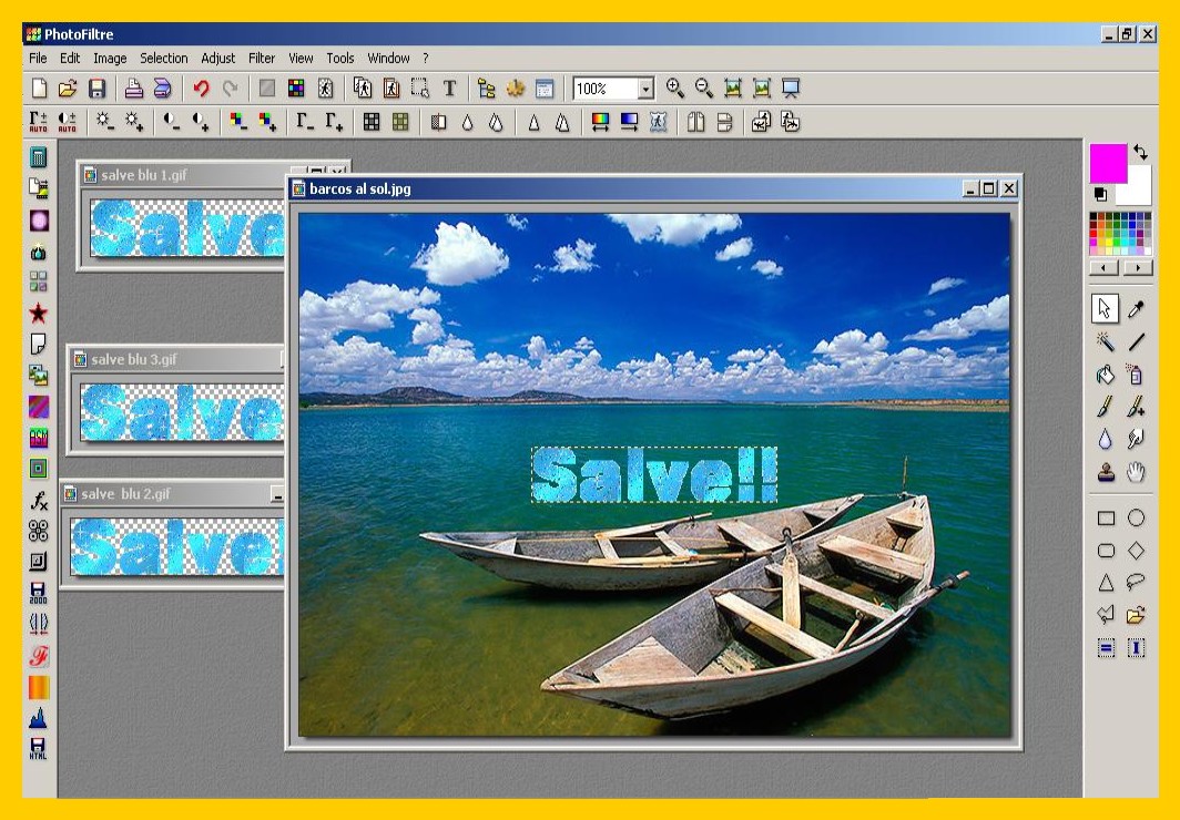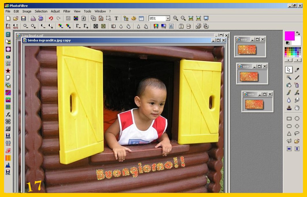 La scritta si sistemerà nello stesso punto dove l’avete messa nella prima immagine, convalidate e salvate ora come avete fatto con la prima (punto 9 ) ma lasciate ancora la vostra immagine su photofiltre, (riducendola ad icona per non confonderla ) per controllare se vi viene bene il risultato finale. Se non vi venisse bene con la freccia rossa a sinistra nel menù degli strumenti in alto potete andare indietro e tornare fino ai parametri delle vostra selezione ed eventualmente correggerli e continuare senza dover rifarvi di nuovo tutto. Procedete con la terza scritta e la terza immagine come con la seconda e così con altre se ce ne fossero di più.