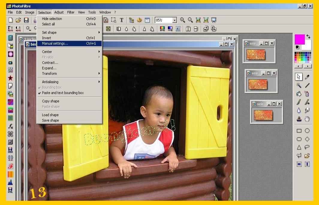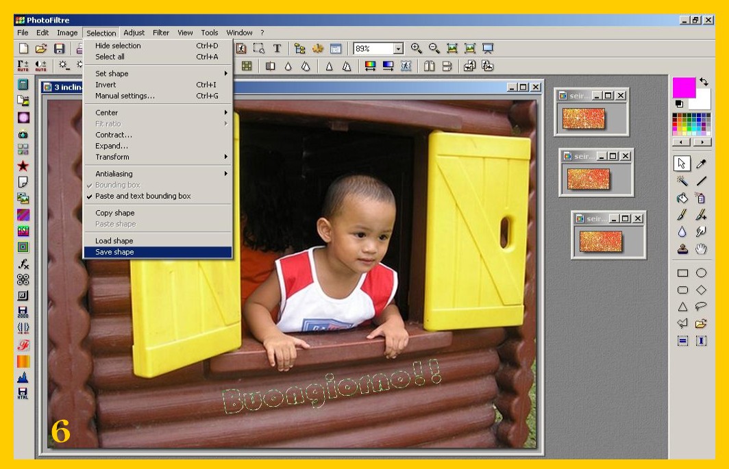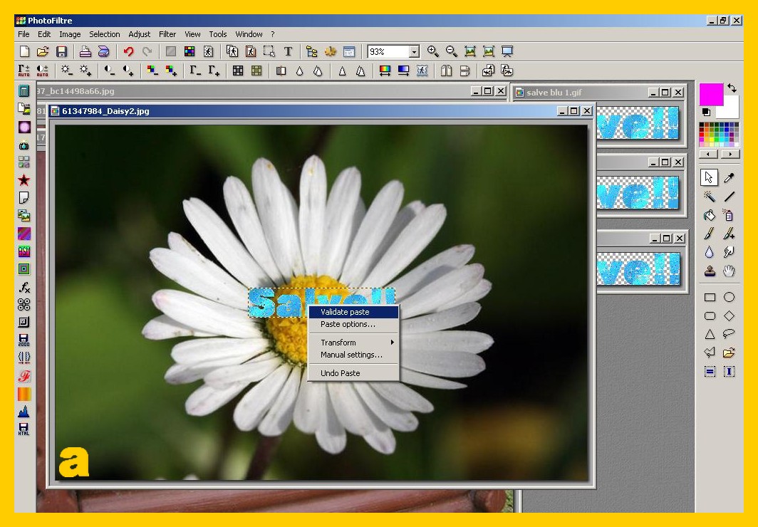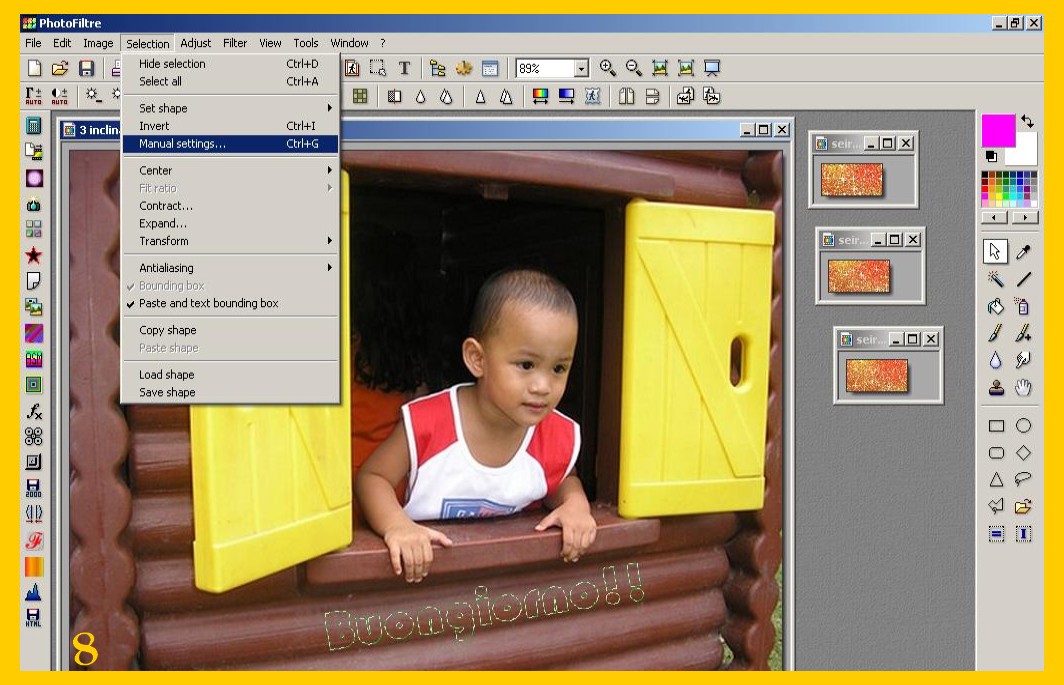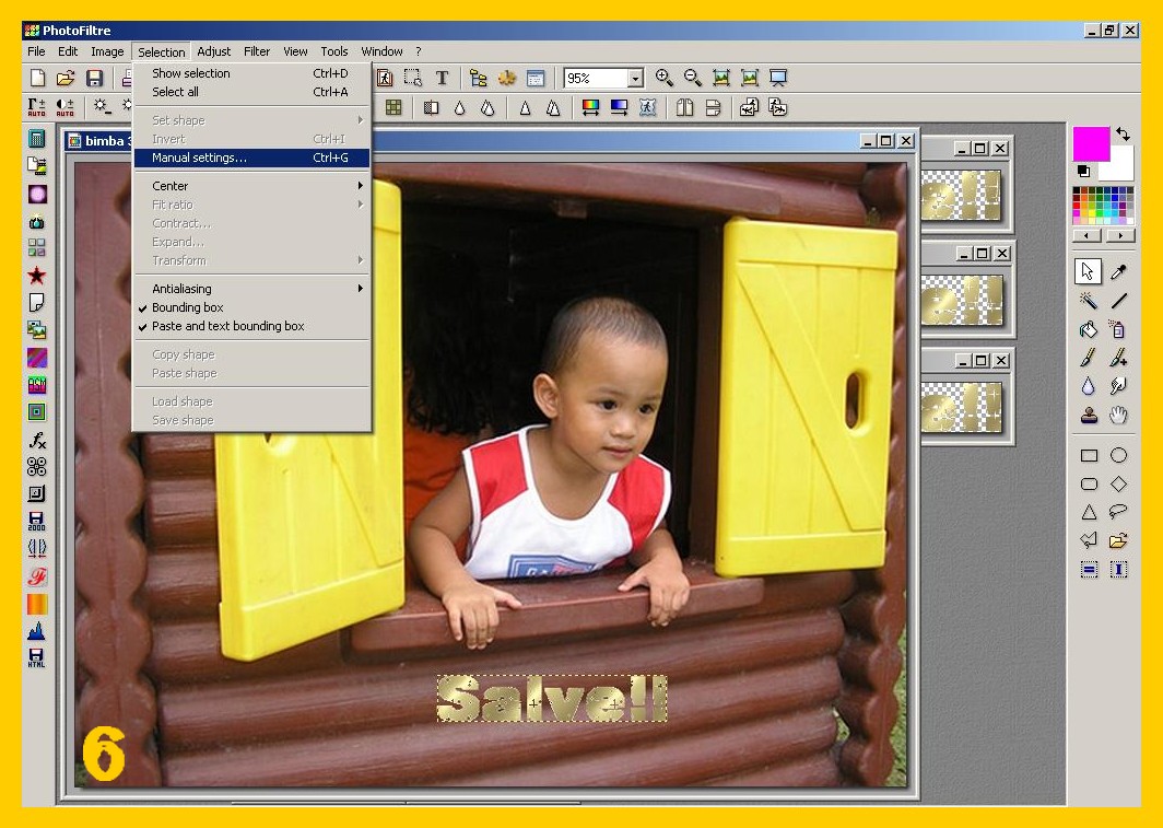La scritta si sistemerà nello stesso punto dove l’avete messa nella prima immagine, convalidate e salvate ora come avete fatto con la prima (punto 9 ) ma lasciate ancora la vostra immagine su photofiltre, (riducendola ad icona per non confonderla ) per controllare se vi viene bene il risultato finale. Se non vi venisse bene con la freccia rossa a sinistra nel menù degli strumenti in alto potete andare indietro e tornare fino ai parametri delle vostra selezione ed eventualmente correggerli e continuare senza dover rifarvi di nuovo tutto. Procedete con la terza scritta e la terza immagine come con la seconda e così con altre se ce ne fossero di più.