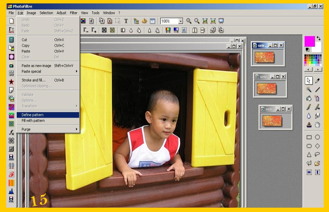 12. Toccate ora per attivare (diventa blu sopra) il vostro primo glitter e cliccate su Modifica – Utilizza come Trama (EDIT – DEFINE PATTERN) (imm. 15) ![]()