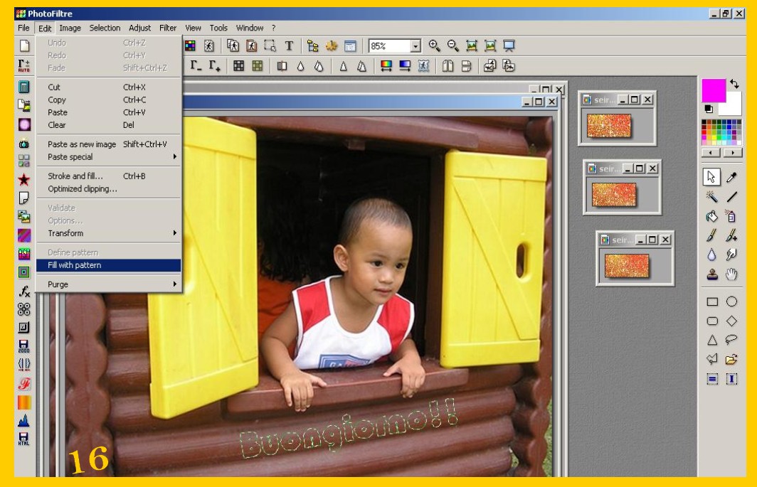 13. Poi toccate la vostra immagine per attivarla e ancora di nuovo su Modifica e Riempi con la Trama (EDIT – FILL WITH PATTERN) (imm. 16)