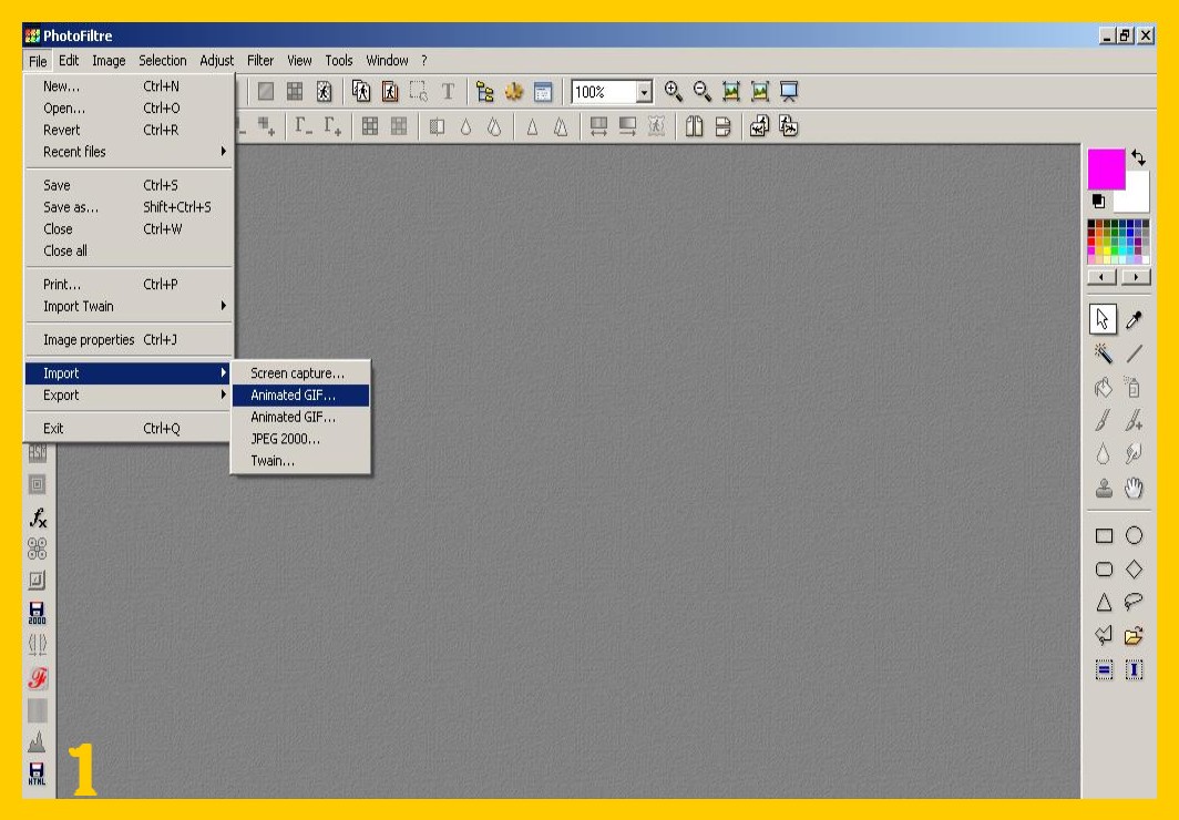 1. Una volta scelto il vostro glitter e con il plugin Importazione Gif Animate installato se non lo avevate, aprite il glitter scelto importandolo come gif animata : File – Importa – Gif Animata (FILE – IMPORT ANIMATED GIF) (imm.1) ![]()