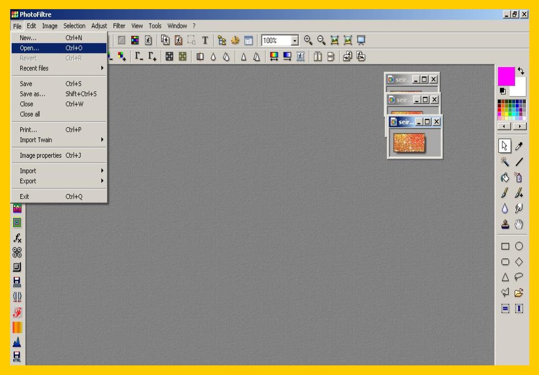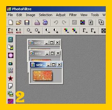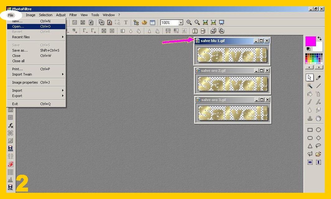 1. Aprite tutte e 3 (o quante siano) le scritte glitter in photofiltre: File – Apri (FILE – OPEN) (imm. 1).