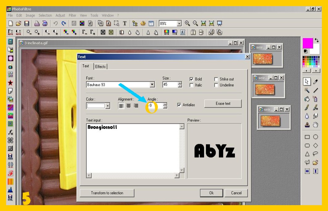 5. A questo punto se voleste per caso inclinare la scritta perché nella foto ci sta meglio (come nel caso della foto della bambina) o semplicemente perché vi piace di più così, mettete un valore positivo o negativo, a secondo del lato verso il quale la vogliamo inclinare, nella finestrina Angolo (ANGLE). (imm. 5)