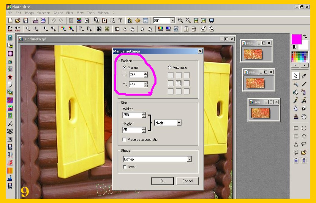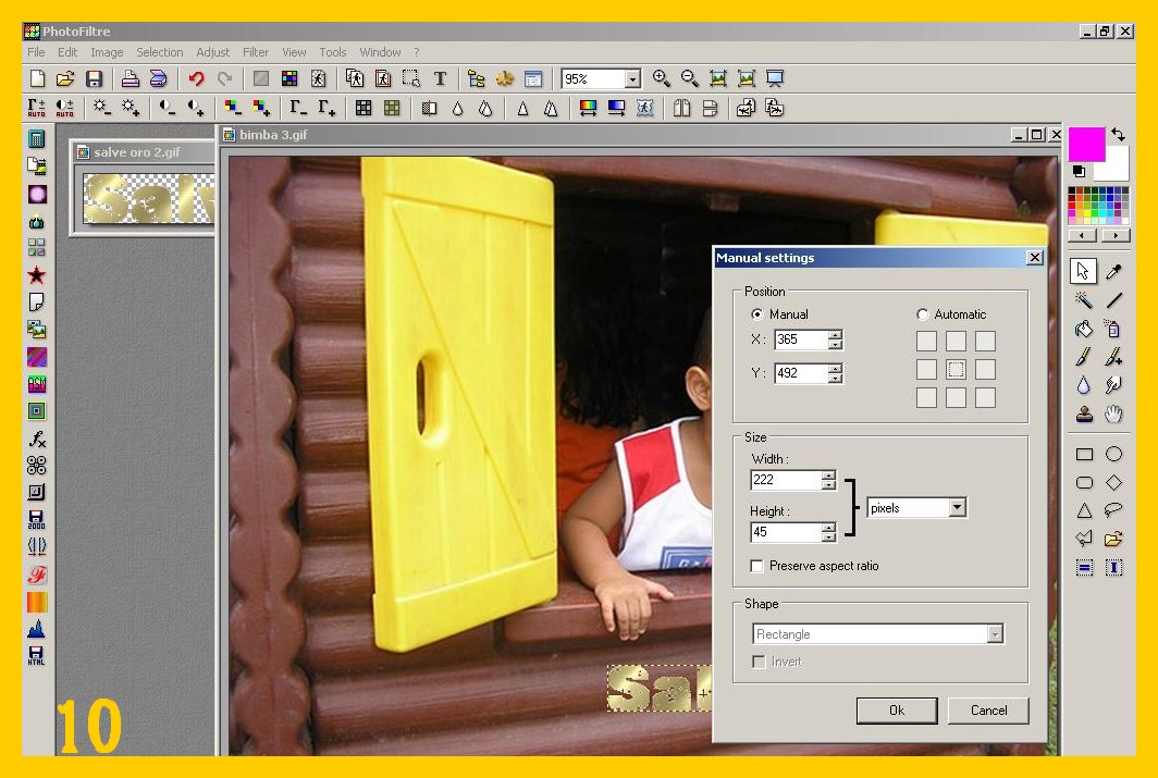 10. Ora prendete la vostra seconda scritta glitter e la vostra seconda immagine e procedete come nei punti 3 e 4. Appena l’avete incollata ed è attorniata della selezione cliccate su Selezione – Impostazioni Manuali (SELECTION- MANUAL SETTINGS), spostate con la freccia i valori di “x” e “y” fino ad averli uguali a quelli della prima immagine (imm. 10).
