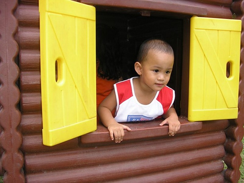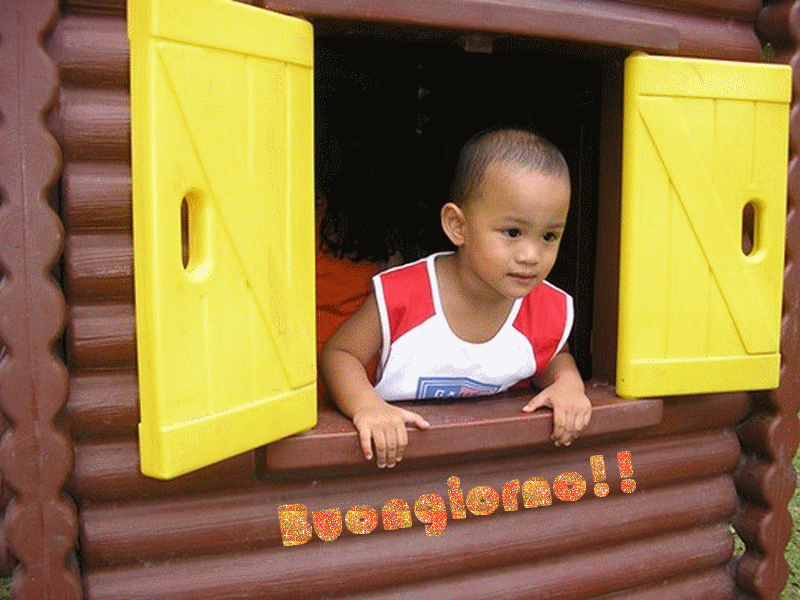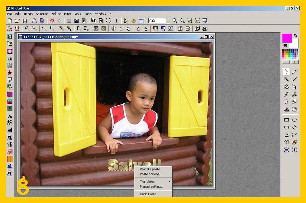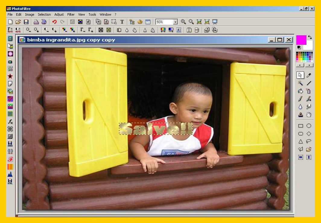 Come avrete visto in questa foto la bambina, il bordo della finestra e i listelli della casetta sono leggermente inclinati e la scritta completamente diritta non sembra andare molto d’accordo. Perciò procederemo ad inclinarla leggermente. Per fare ciò abbiamo bisogno di fare direttamente la scritta nell’immagine senza usare altre scritte precedenti, per cui ora dobbiamo…