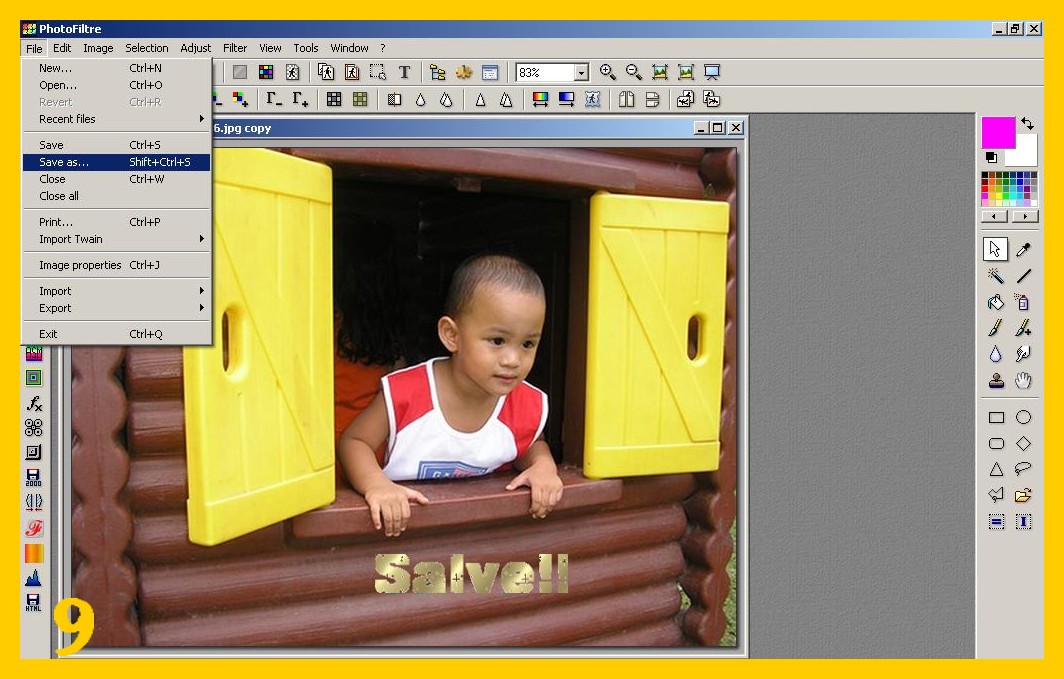 Salvate ora come gif la vostra prima immagine con la scritta: File – Salva con Nome (FILE – SAVE AS) (imm. 9). ![]()