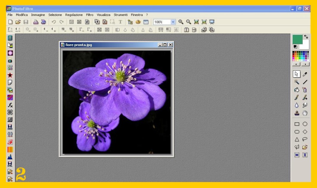 1. Aprite in Photofiltre la vostra immagine col fiore: File – Apri (FILE – OPEN) (imm. 1 e 2) fiore-scintillante-1.jpg fiore-scintillante-2.jpg