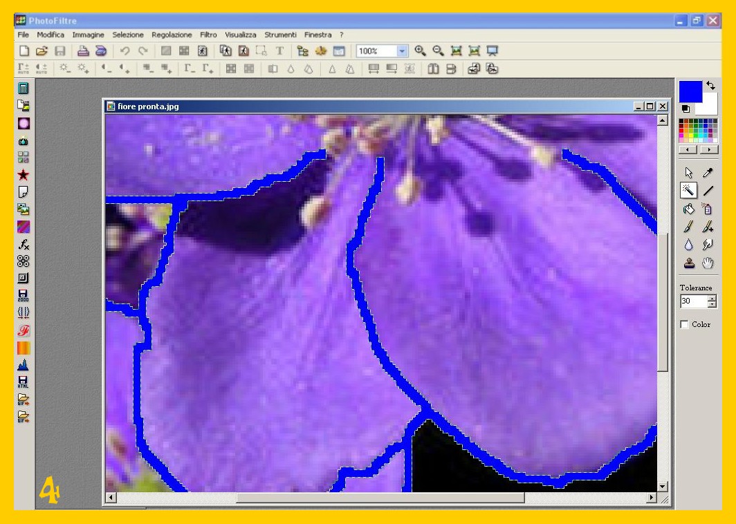 Ora volevo provare a fare un contorno su una mia foto,scattata con una macchina digitale e precisamente un fiore lilla, da ieri che provo ma non riesco a selezionare bene l’immagine con la bacchetta magica, mi seleziona solo alcune parti. Ti volevo anche chiedere se con il pennello si può ripassare più volte sullo stesso segno, un caro saluto