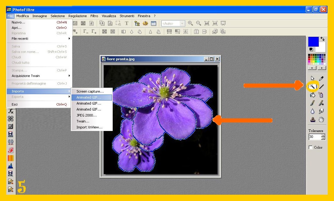 5. Ora procedete aprendo il glitter con cui contornerete il vostro fiore: File – Importa Animated Gif (FILE – IMPORT ANIMATED GIF) (imm. 5)