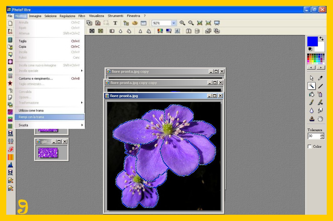 31. Ciao Giovanna 🙂 scusa per il ritardo, inizio a risponderti da qua… Se scompare l’immagine completa sotto il glitter non può essere che per un motivo, non hai selezionato il bordo… Quando attivi la tua immagine prima di cliccare su modifica-riempi con la trama devi vedere che il bordo sia selezionato e così solo il bordo verrà riempito dal glitter… Se non hai nulla selezionato tutto viene ricoperto dal glitter mentre se hai una selezione solo la parte selezionata verrà riempita dal glitter.