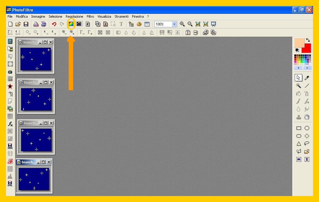 E, come avevo promesso, appena ho avuto un attimo di tempo l’ho dedicato a trovare un modo semplice, per quanto possibile, di riuscire a far “scintillare” con stelline i bordi esterni di un’immagine con Photofiltre.