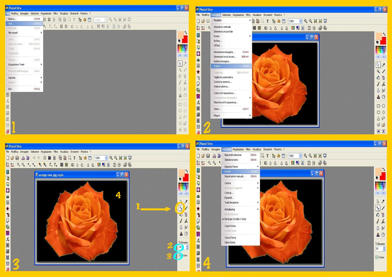 3. Sul Menù degli Strumenti di destra cliccate sulla Bacchetta Magica cerchiata di giallo ed indicata nella freccia (punto 1 dell’immagine 3). Mettete, sotto gli strumenti, tolleranza 30 (punto 2) e selezionate la casellina colore (punto 3). Toccate ora la vostra immagine fra il fiore ed il bordo con la bacchetta magica (punto 4) e vi verrà selezionata questa ed il contorno esterno (imm.3)