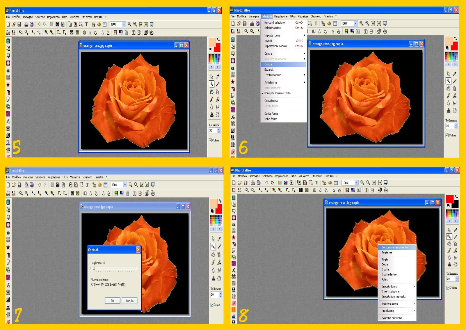 7. Vi appare ora una finestra nella quale dovrete mettere il valore che vi serve per la riduzione in dentro, la contrazione appunto, della vostra selezione. Come vedete nell’immagine, io ho messo soltanto 4 di valore, dato che il mio intento era di fare scintillare soltanto la linea di bordo dell’immagine e scintillerà solo la parte compresa fra la prima selezione del bordo del nostro fiore fatta con la bacchetta magica e questa seconda selezione contratta. Potete aumentare il valore sempre che la vostra immagine non sia molto stretta e piccola, si vedranno più stelline e qualcuna sarà un po’ più all’interno della linea del contorno…Se la vostra immagine è stretta e lunga mettete un valore minore. Una volta messo il valore confermate con OK. (imm.7)