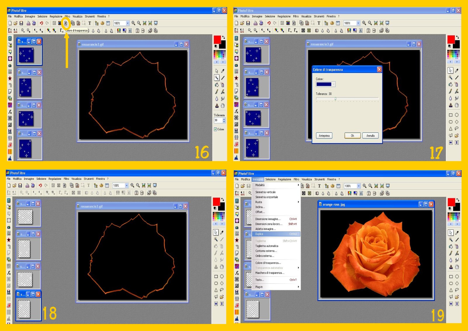19. Rese tutte le vostre immagini “scintillanti” trasparenti (imm. 17 e 18), aprite la vostra immagine originale (il fiore) se l’avevate ridotta ad icona o la toccate per attivarla, se invece l’avevate solo a lato; poi la duplicate tante volte quante sono le immagini scintillanti che avete, cliccando su Immagine – Duplica (IMAGE – DUPLICATE) (imm.19) In questo caso ne farete 4 immagini uguali in tutto.