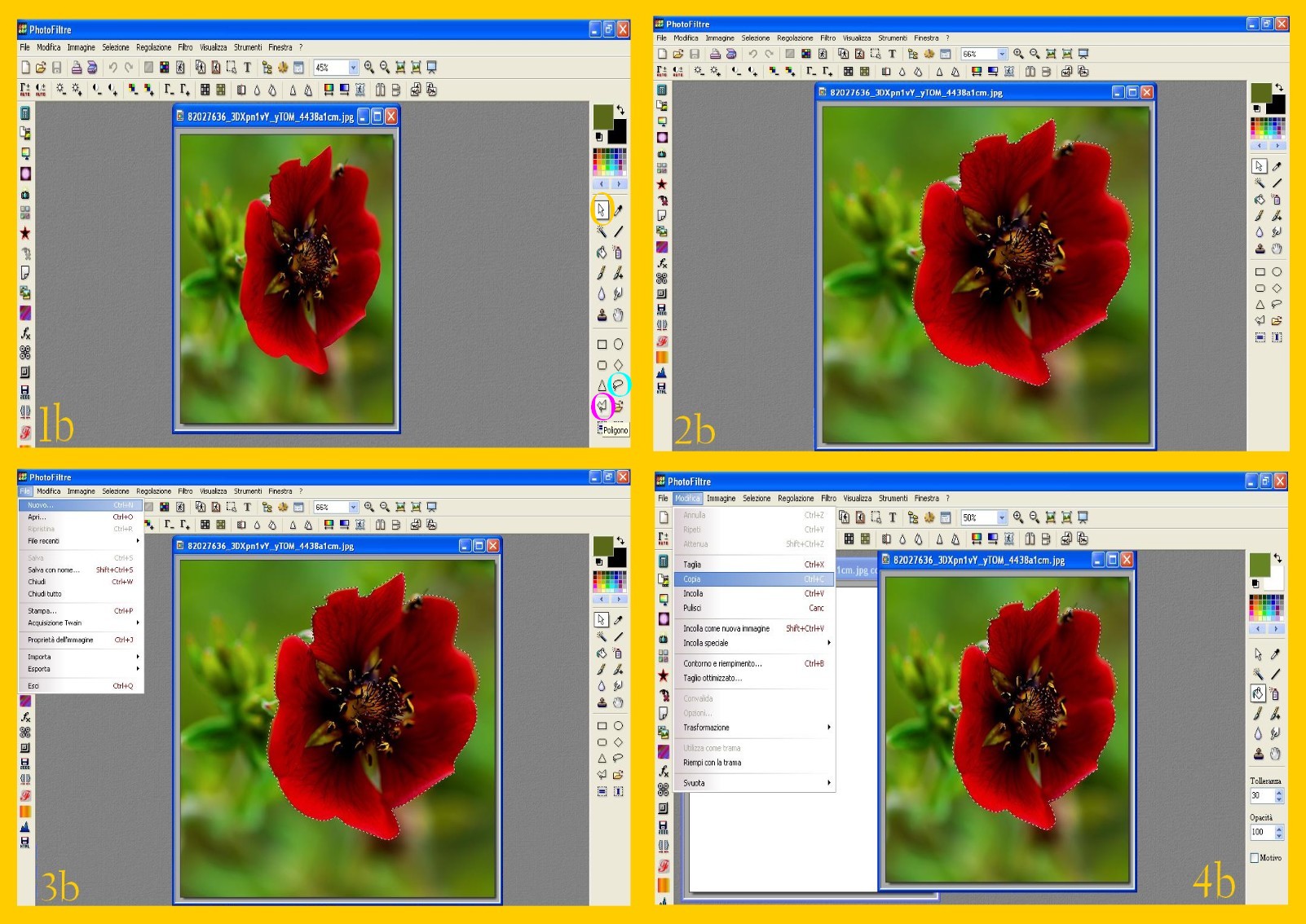 2. Sul Menù di destra cliccate sulla Freccia di Selezione (Selection Tool) in alto subito sotto i Colori cerchiata in giallo nell’imm 1b. Scendete poi nel Menù e cliccate o nel Lazo (cerchiato in azzurro) o nel Poligono (rosa) per selezionare la vostra immagine. Ho già spiegato l’uso di entrambi in …e scintillano anche gli altri colori ed ora ne accenno soltanto. Io preferisco di gran lunga il Poligono perché permette di fare tanti piccoli tratti e così si riesce a fare qualunque contorno con gran facilità, mentre con il Lazzo bisogna fare tutto in una sola volta senza mai alzarlo dal contorno che state facendo o perderete tutta la vostra selezione.