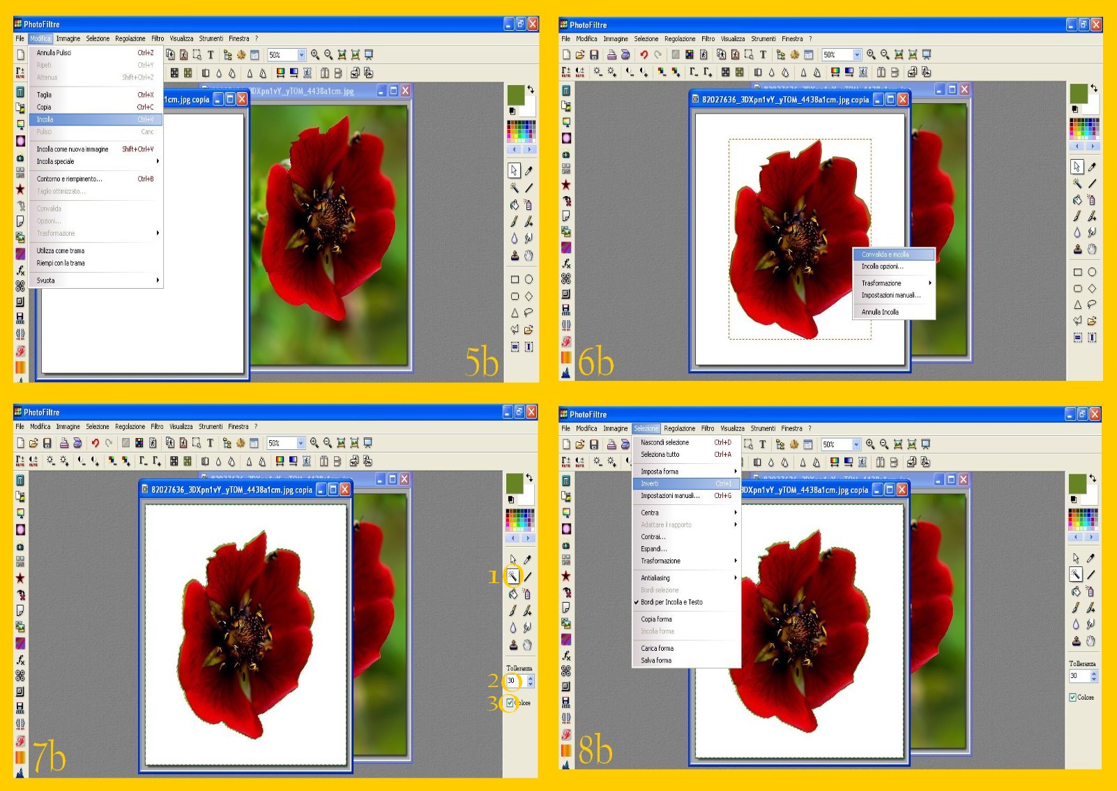 8. Nel menù di destra cliccate sulla Bacchetta Magica (punto 1 imm.7b) e sotto mettete 30 di tolleranza (punto 2 imm. 7b) e selezionate Colore (punto 3 imm. 7b), andate sul vostro nuovo documento e cliccate nella zona dal fiore all’angolo esterno. Vi rimarrà selezionato il vostro fiore ed anche il contorno esterno del documento (imm.7b)