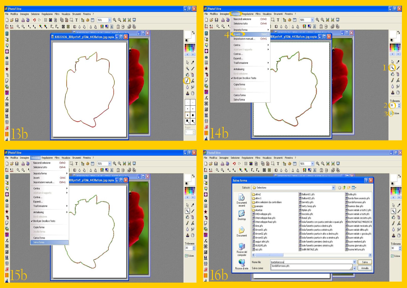 15. Andate di nuovo al Menù di destra e cliccate sulla Bacchetta Magica. Mettete come valore di tolleranza 30 (punto 2) e selezionate la casellina del colore. Ora toccate la vostra immagine con la Bacchetta Magica fuori dall’immagine. Vi apparirà selezionato il bordino fra il bordo finale del fiore e la nuova selezione e quello esterno tutt’attorno. (imm.14b)