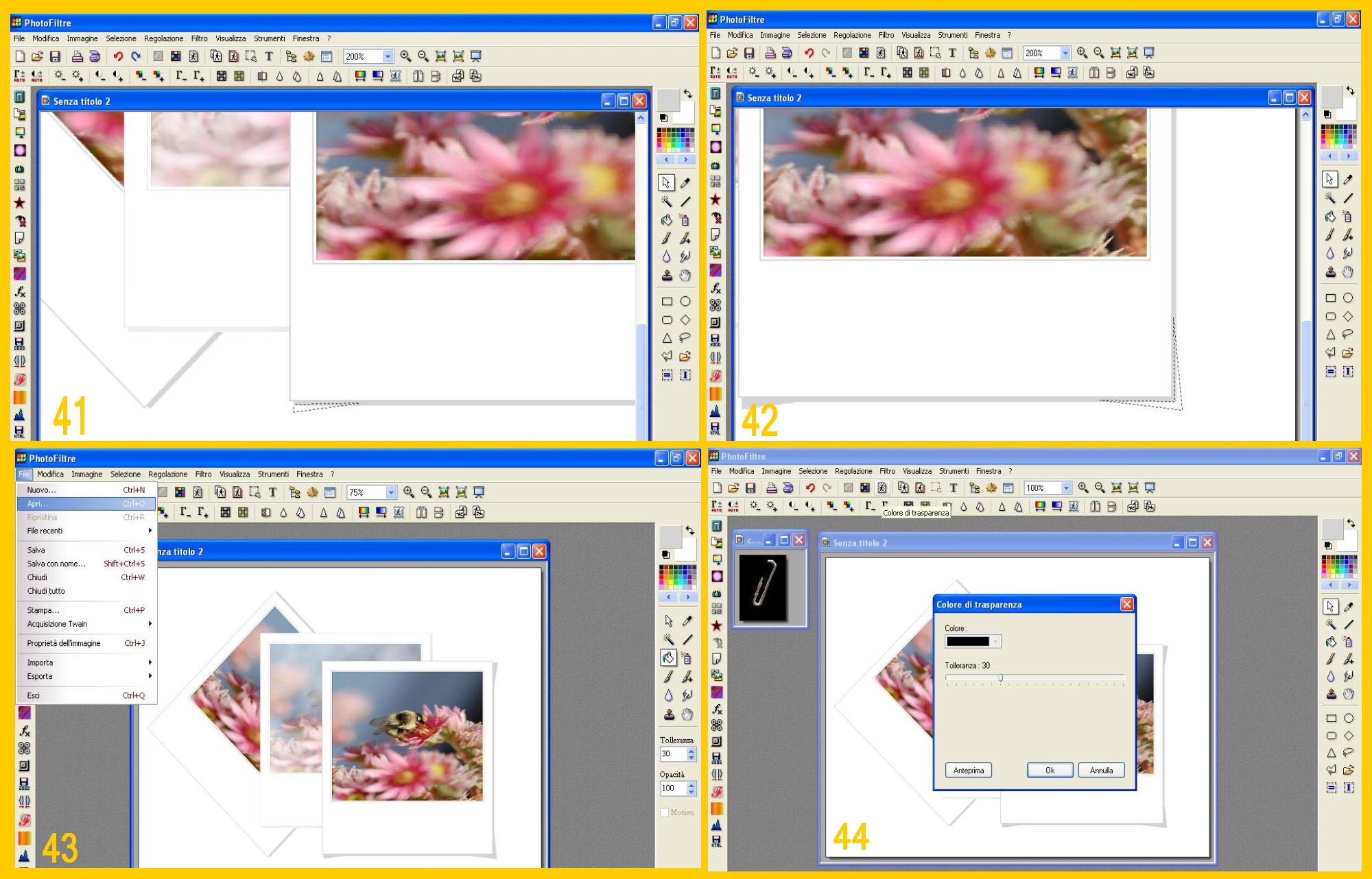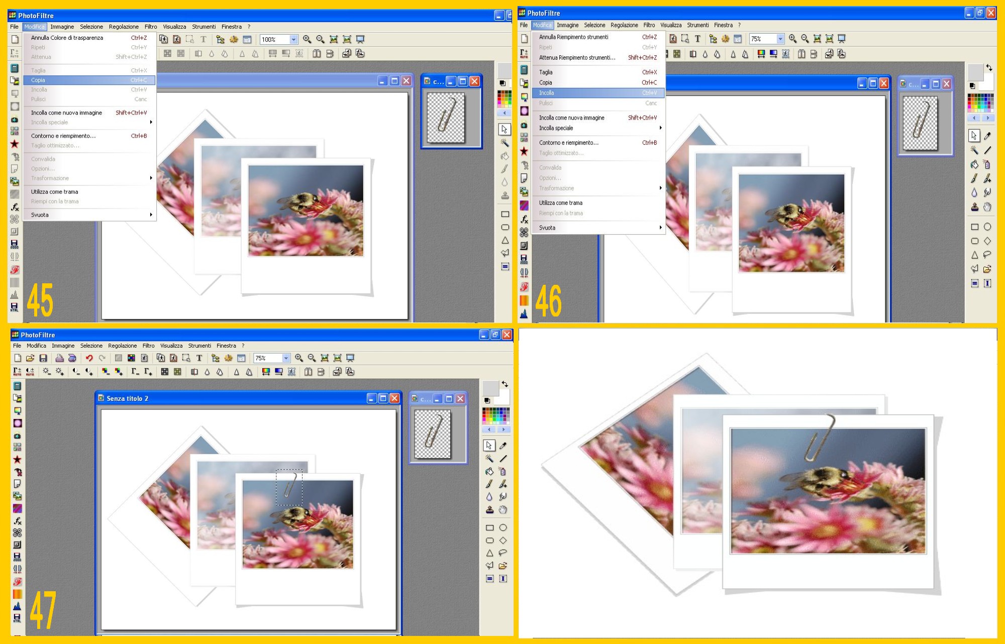 32. Clicate sull’Icona di Trasparenza nel Menù in Alto e dopo aver confermato col si la prima domanda, mettete 30 di tolleranza, guardate l’anteprima e se tutto è a posto confermate con Ok (imm.44). Così diventerà trasparente lo sfondo ed ora Modifica – Copia (EDIT – COPY) (imm.45) e poi toccando il documento con le polaroid Modifica – Incolla (EDT – PASTE) (imm.46). Sistemate la clip e convalidate. (imm.47)![]()