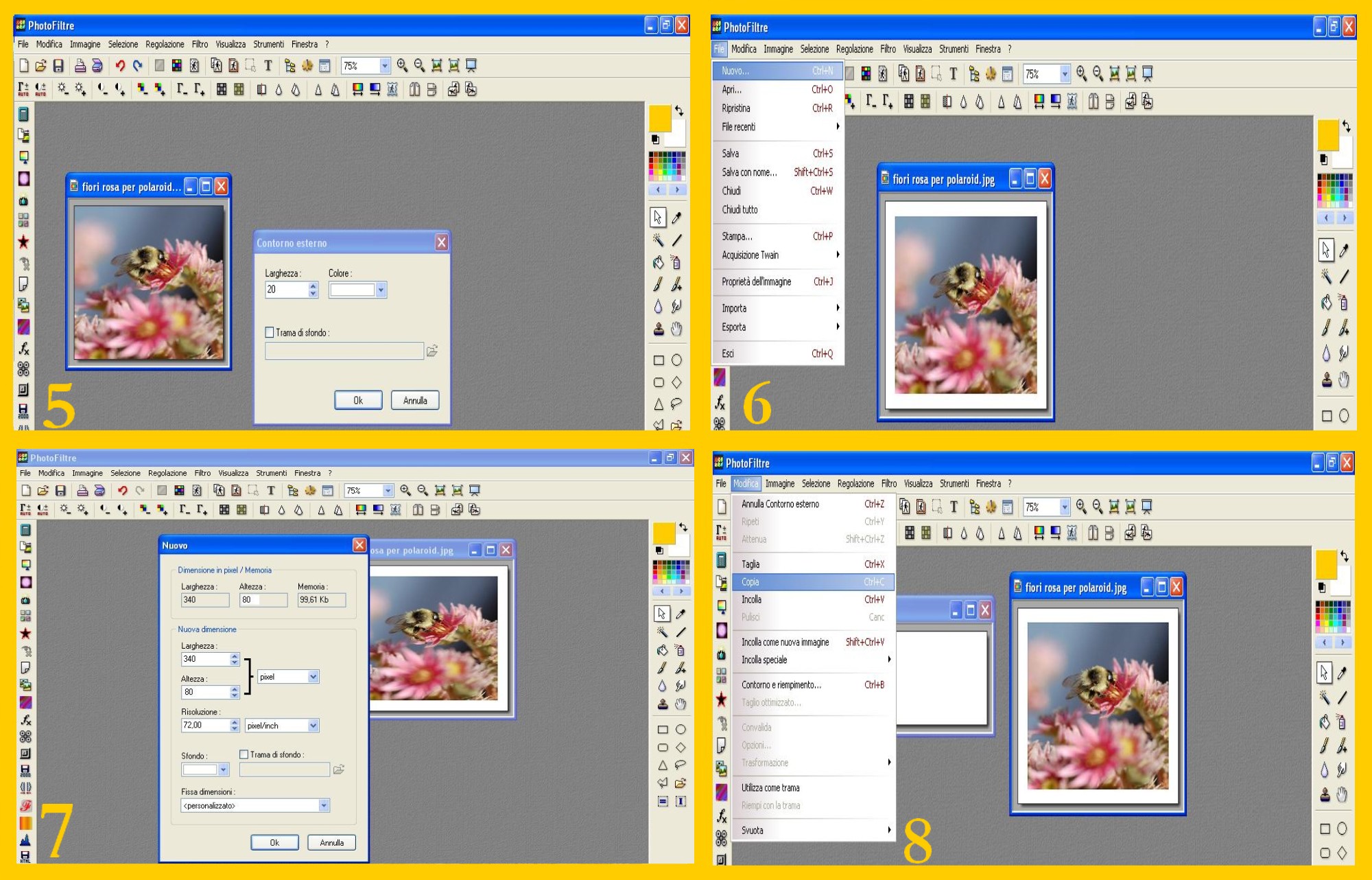 2. Per fare ora la cornice bianca esterna della polaroid cliccate su Immagine – Contorno Esterno (IMAGE – OUTSIDE FRAME) (imm.4) e nella finestra succesiva mettete: di larghezza 20 e di colore, il bianco. (imm.5)