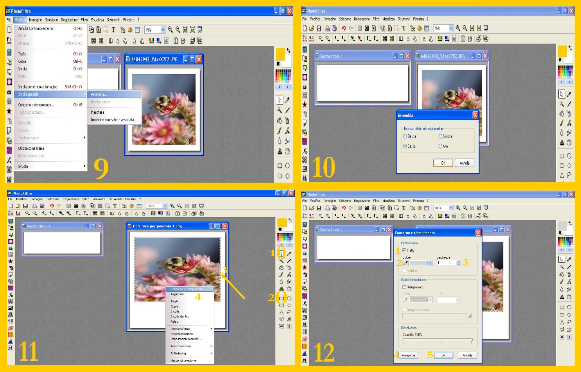 5. Cliccate ora in Modifica e Copia (EDIT – COPY) (imm. 8 ) e poi toccando la vostra immagine tornate a cliccare su Modifica – Incolla Speciale – Assembla (EDIT – PASTE SPECIAL – ASSEMBLE) (imm. 9) e nella finestra che si apre successivamente selezionate Basso (BOTTOM) e confermate con OK. (imm 10).