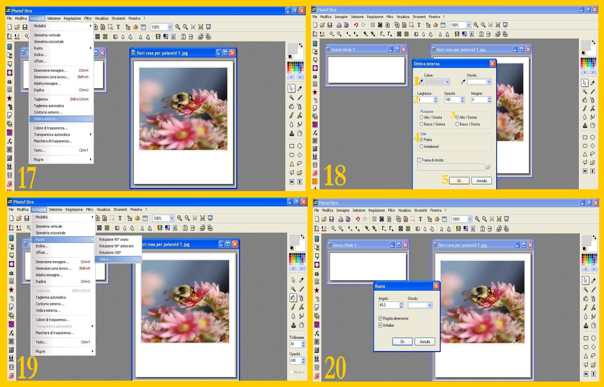 14. Nella finestra che vi appare mettete 45 gradi nell’angolo, selezionate Regola Dimensione (ADJUST SIZE) e ANTIALIAS e confermate con Ok. (imm.20). Ora la vostra polaroid ha fatto un giro di 45 gradi. ![]()