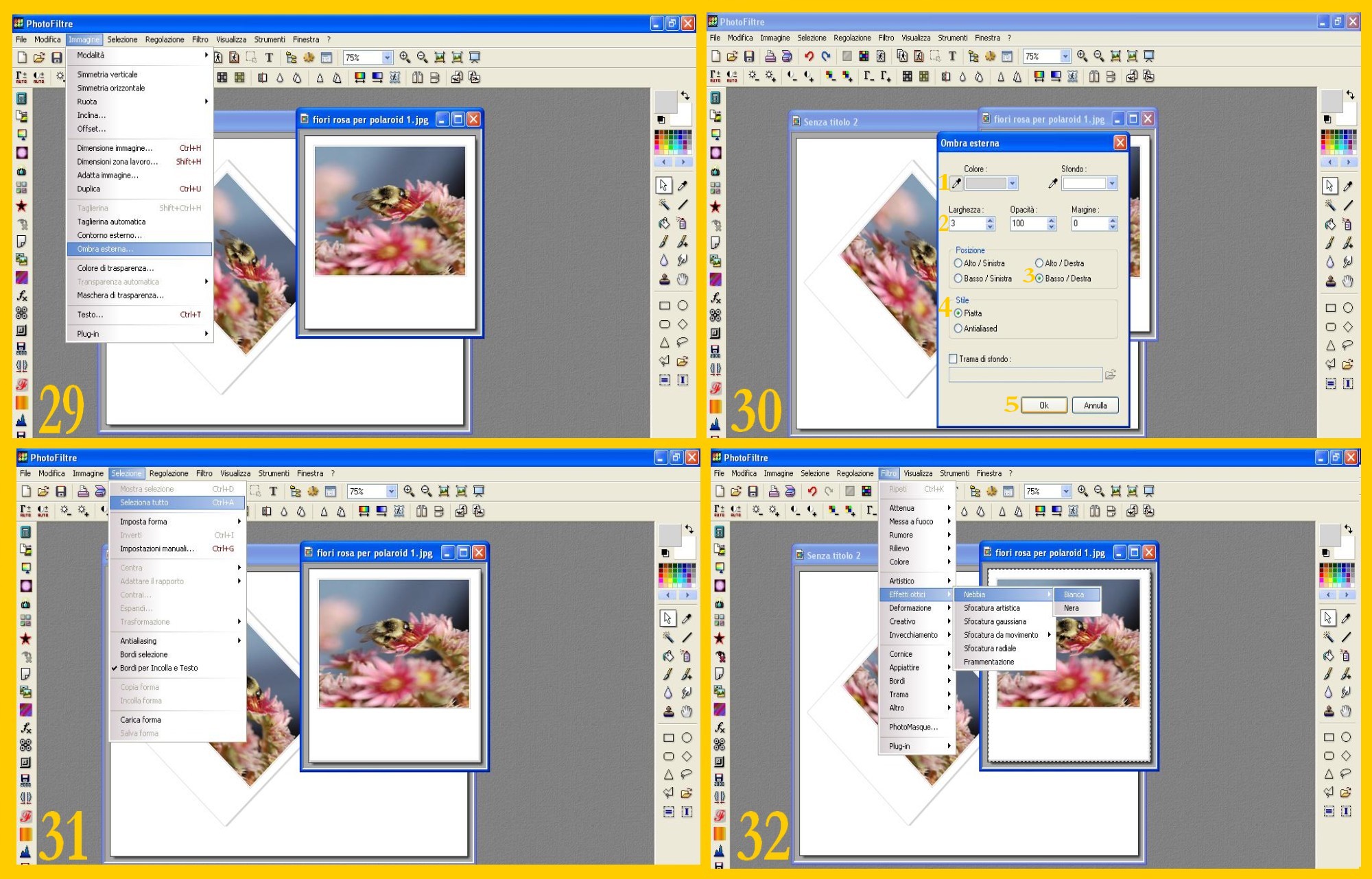 22. Ora il bordo è in basso ed a destra. Per schiarire la foto ora andate su Selezione – Seleziona Tutto (SELECTION – SELECT ALL) (imm.31) e poi su Filtro – Effetti Ottici – Nebbia – Bianca (FILTRE – VISUAL EFFECT – FOG – WHITE) (imm. 32) e di nuovo ancora 2 volte su Filtro (FILTRE) e subito dopo nella riga sotto a filtro in Ripeti Nebbia (REPEAT FOG). (imm 33). ![]()