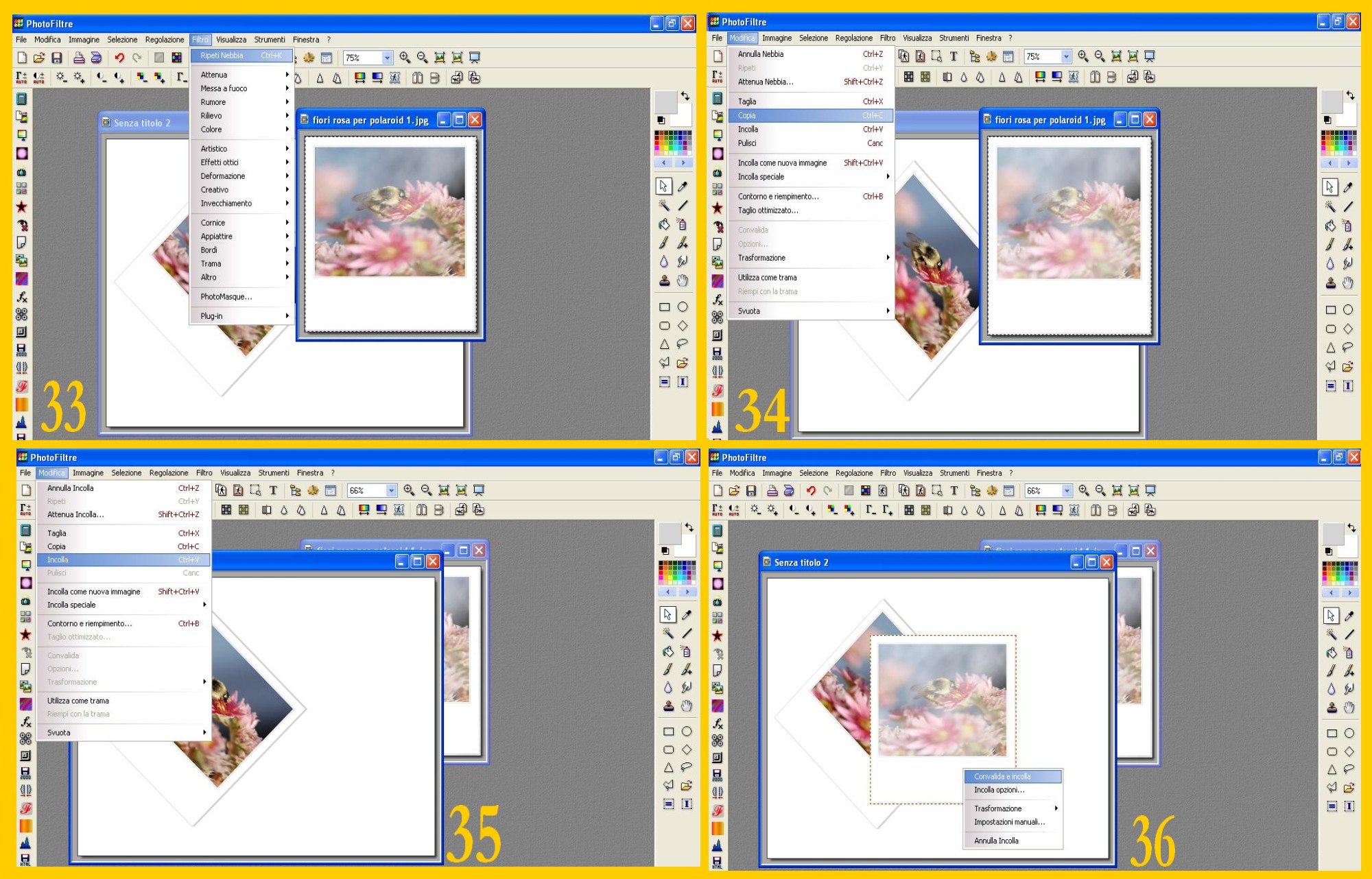 23. Ora la vostra seconda polaroid è a posto e potete incollarla nel documento con l’altra. Andate a Selezione – Nascondi Selezione e poi a Modifica – Copia (EDIT – COPY) (imm. 34)