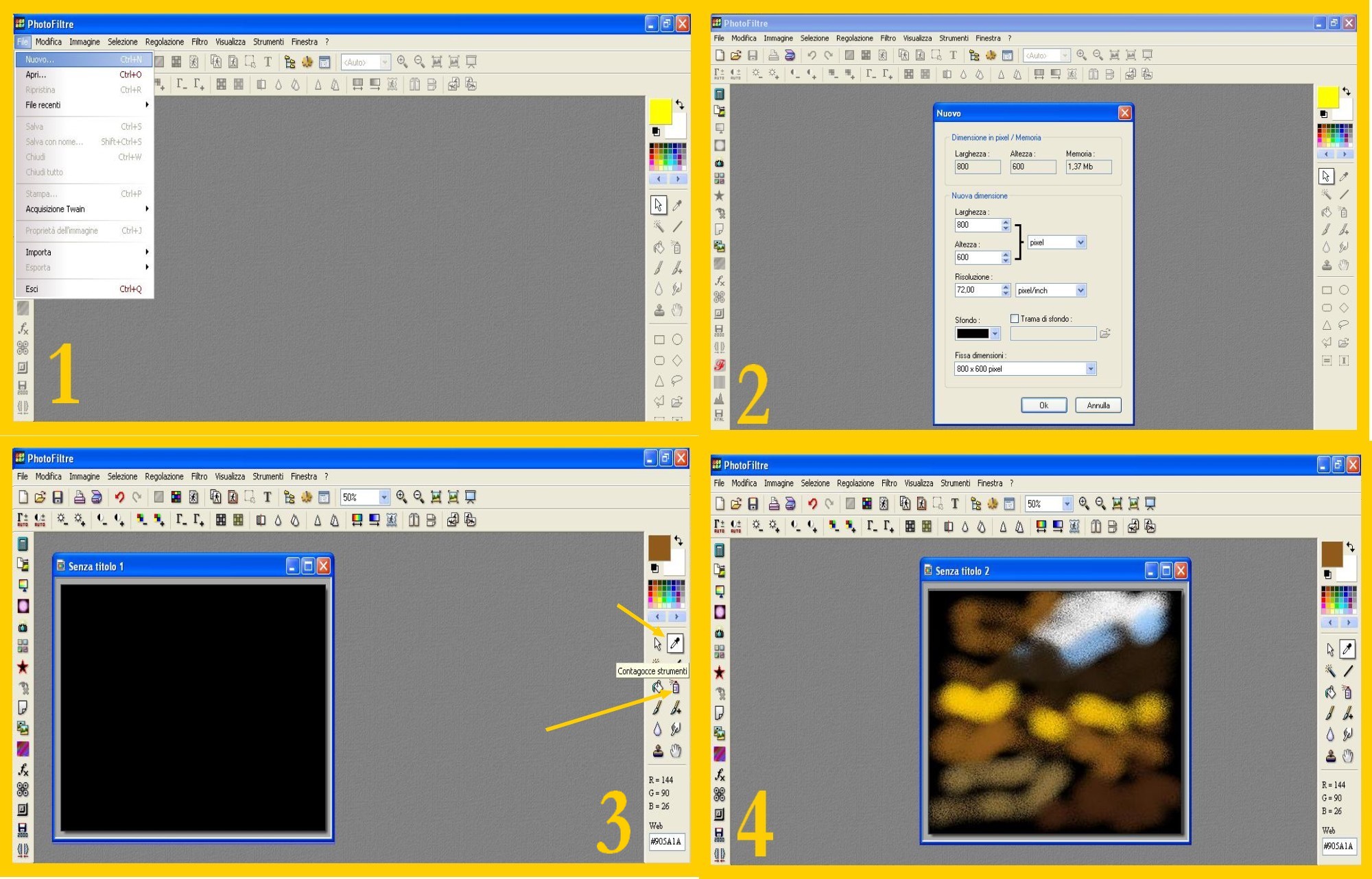 1. Per iniziare aprite un documento nuovo, nero di colore, di 800 x 600: File – Apri (FILE – OPEN). (imm.1 e 2)