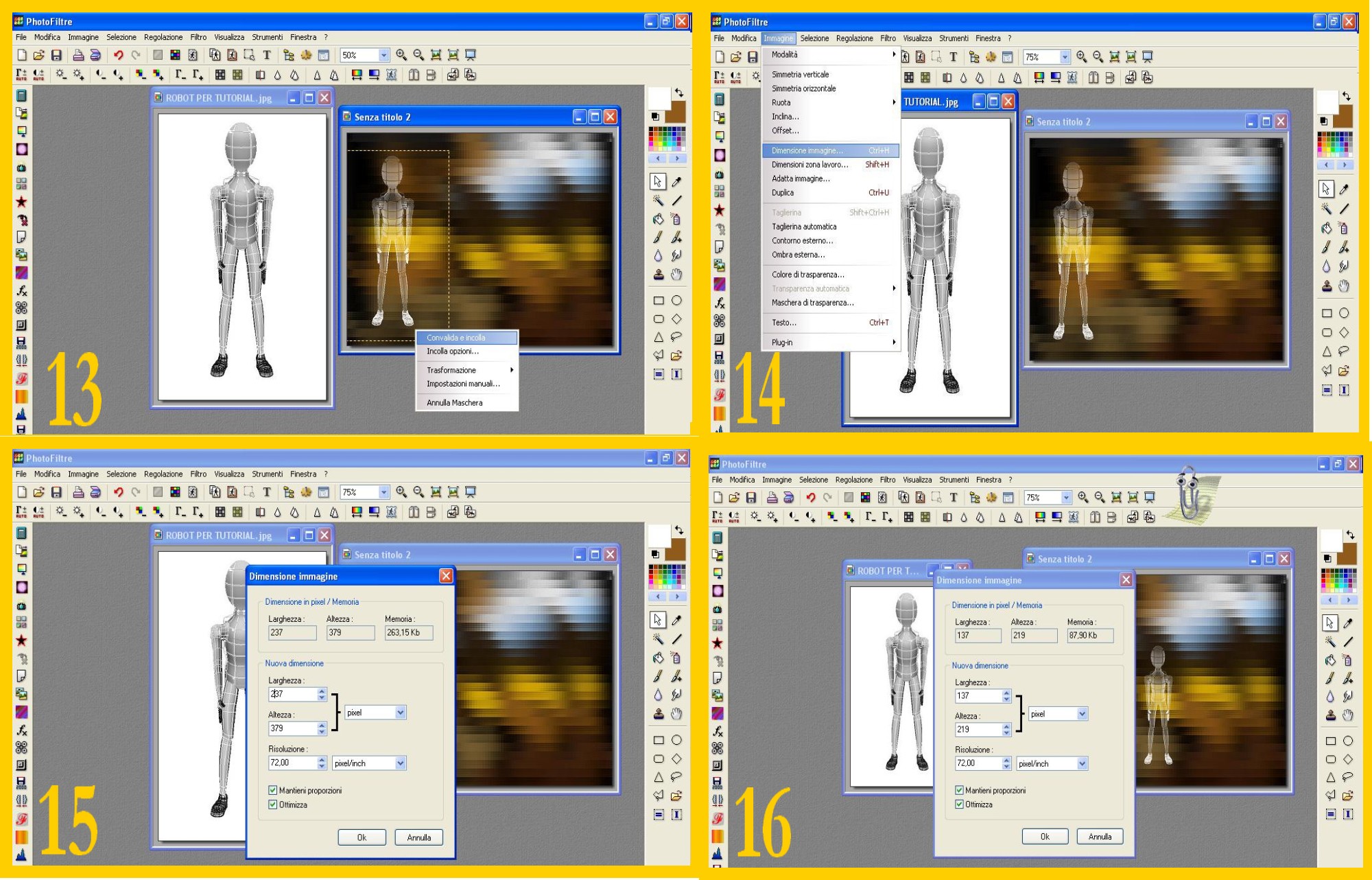 Come ho scritto un po’ ovunque, di grafica non ne so nulla, nemmeno i termini adatti. Ho solo trovato nella mia strada Photofiltre e, cercando di usarlo, sono riuscita ad imparare a fare cose di cui non avevo la più pallida idea, con una gran facilità. La cosa mi ha entusiasmato ed appunto ho pensato che se io che nulla sapevo di pc né di grafica ci riuscivo, chiunque avrebbe potuto farlo ed è per questo che metto questi tutorials . Ma ovviamente Photofiltre ha dei limiti, ed io ancora di più. Se qualcuno che ha nozioni di grafica e dispone dei programmi adatti vede i miei robots potrebbe avere un attacco d’ilarità convulsivo. 😀 Ovviamente i miei robots non starebbero in piedi e sono frutto di una specie di copia disegnata alla meno peggio di qualche robot visto in giro da una che, appunto, di grafica non ne sa nulla. Perciò prendetelo solo per quello che è… 🙂