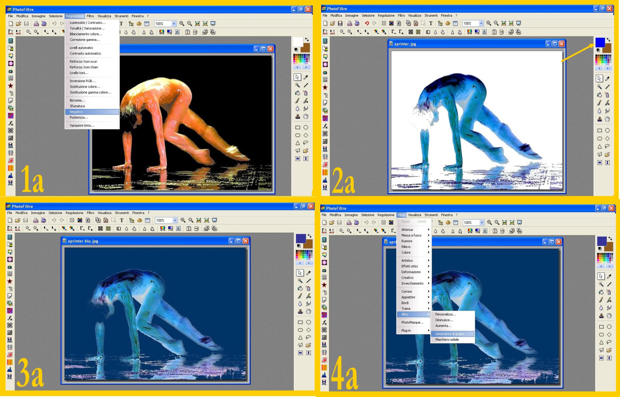 1. Dopo aver aperto la vostra immagine in Photofiltre col solito File – Apri (FILE – OPEN), cliccate in Regolazione – Negativo (ADJUST – NEGATIVE) (imm. 1 a). Vi verrà la foto con lo sfondo bianco ed il resto in varie tonalità di azzurro e blu come nell’immagine 2 a.