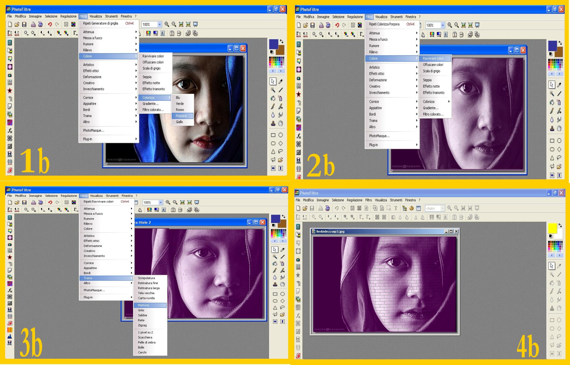 sono stati modificati cliccando su Filtro – Colore – Colorizza – Porpora (FILTER – COLOR – COLORIZE – PURPLE) (imm. 1b) che poi ho ravvivato cliccando su Filtro – Colore – Ravvivare Colore (FILTER – COLOR – RAVIVE COLORS) una volta. (imm. 2b) Per fare l’effetto mattoni basterebbe andare su Filtro – Trama – Mattone (FILTRE- TEXTURE – BRICK) dopo aver selezionato nella foto col Poligono solo la parte del volto (imm. 3b). Ma c’è un problema, cioè vengono linee di mattoni assolutamente diritte. (imm 4b) ![]()