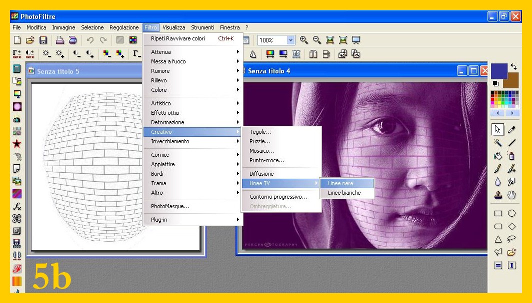 Se applicate questa, ovviamente non dovrete andare a Texture e Brick come detto prima, dato che appliccherete direttamente i mattoni da questa specie di mascherina. Sia che usiate un sistema o l’altro, non resta altro che tornare su Filtro – Creativo – Linee Tv – Linee nere (FILTRE – STYLIZE – SCANLINES – BLACKLINES) (imm. 5b) e cliccare una volta. ![]()