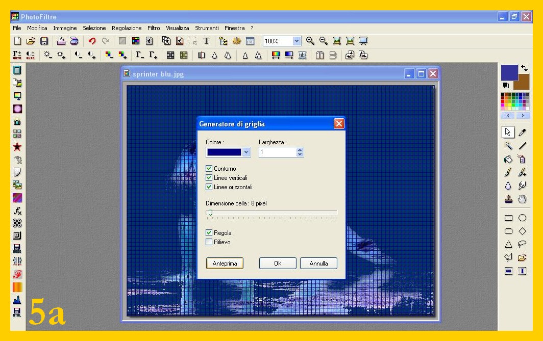 Scegliete come Colore il blu, 1 di Larghezza, selezionate Contorno, Linee Orizzontali e Linee Verticali, mettete 8 pixels come Misura dei Quadrettini, selezionate Regola (Ad just) e Rilievo (Relief), controllate l’anteprima (imm. 5 a) e se vi sembra che vada bene confermate con ok. ![]()