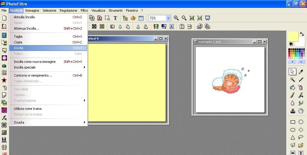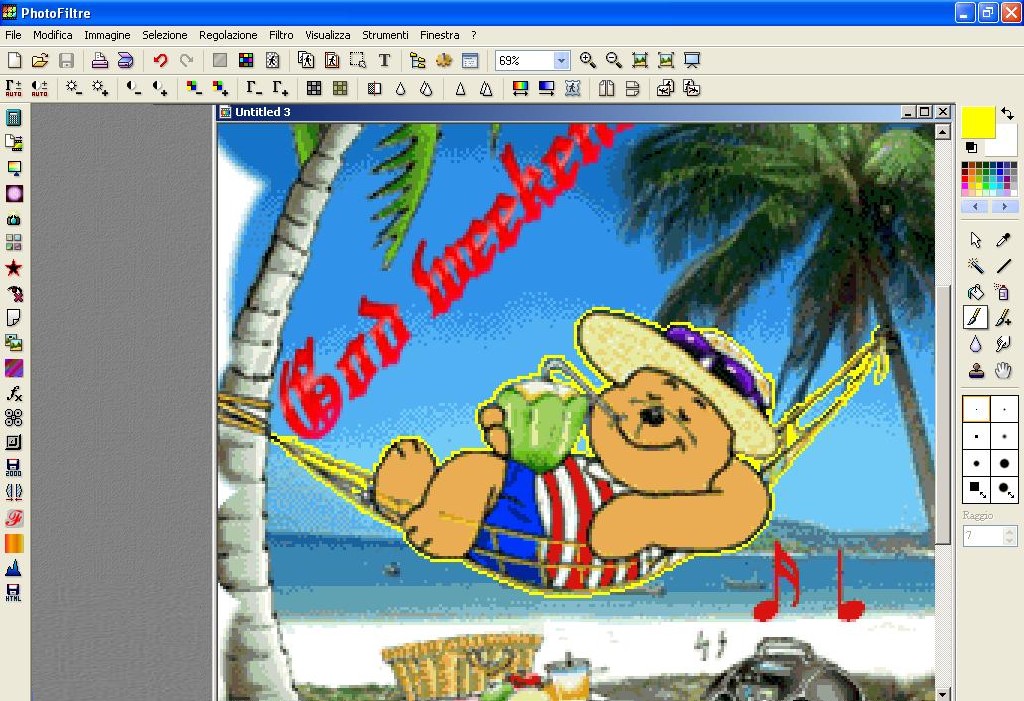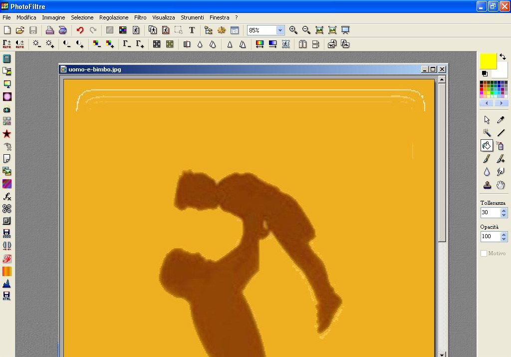 Clicchiamo poi in alto nei Menù dei Colori, scegliamo un colore che non sia presente nella parte d’immagine che vogliamo spostare, clicchiamo poi nel Pennello che si trova a sinistra (nel menù di Photofiltre sulla destra ) e scegliamo la misura con cui vogliamo fare la nostra riga. Per non correre il rischio di entrare dentro al contorno cancellando parti dell’immagine, conviene scegliere le misure più piccole, la prima o la seconda in alto al massimo.