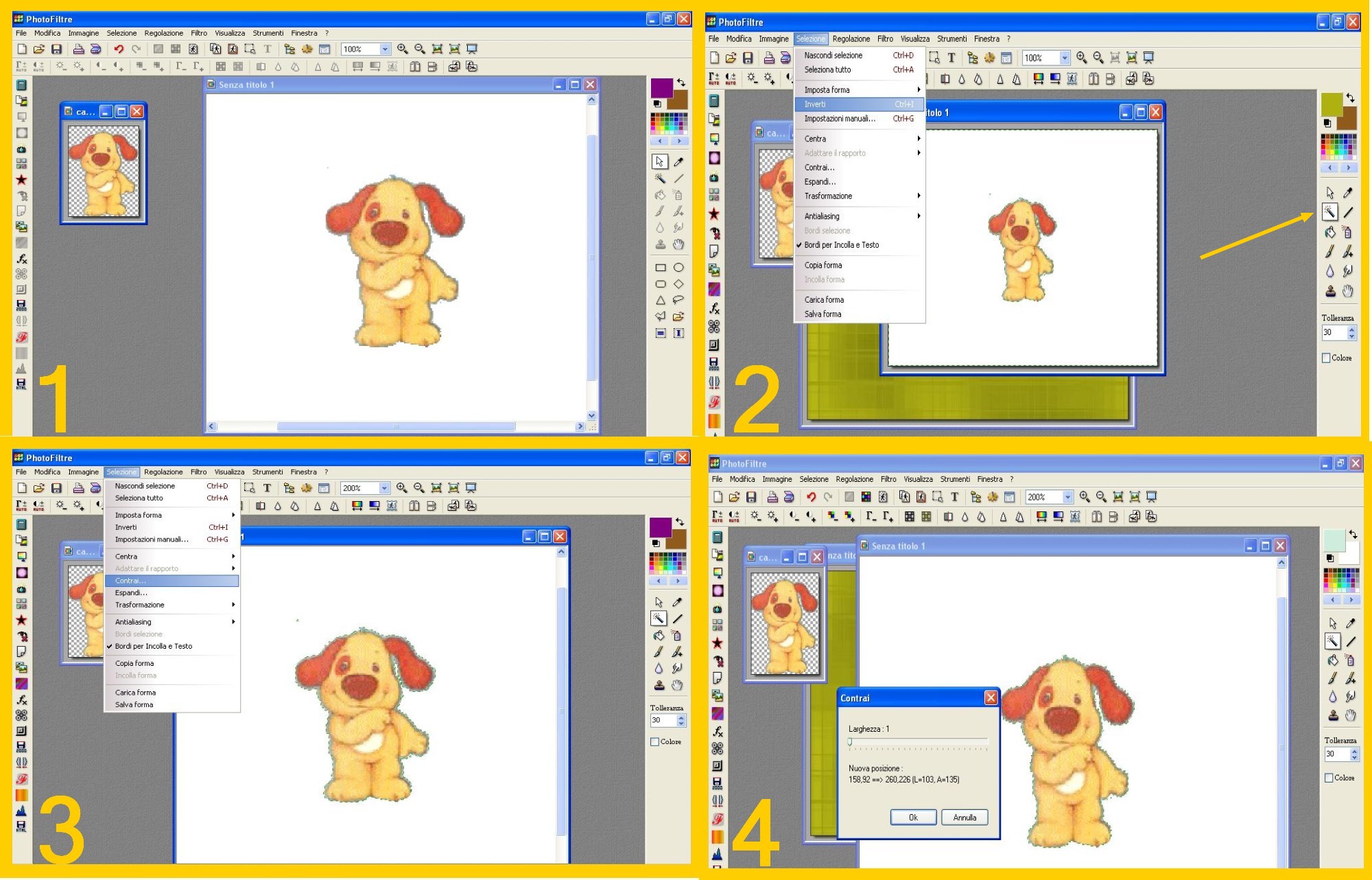 Ci troveremo selezionato tutto il bordo esterno ed il contorno dell’immagine. Cliccheremo ora nel Menù in Alto su Selezione – Inverti (Selection – Invert) e così rimarrà solo selezionata la nostra immagine che ora potremo incollare sullo sfondo o immagine desiderata col solito sistema (Modifica – Copia/ EDIT – COPY e poi, dopo aver toccato l’immagine su cui vogliamo incollarla per attivarla, modifica – incolla / EDIT- PASTE)…