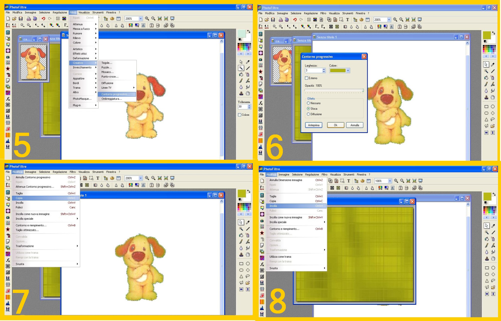 Con il Contorno progressivo potete fare tantissime cose, scritte, decorazioni su immagini, bordini interni e esterni, cornici… Provatelo all’interno ed all’esterno e nelle 3 modalità che si possono usare ( Nessuno, Sfoca, Diffusione) tanto potete guardare sull’anteprima i risultati ogni volta senza che succeda nulla se non confermate e vi sorprenderà vedere quante cose belle potete fare… 🙂