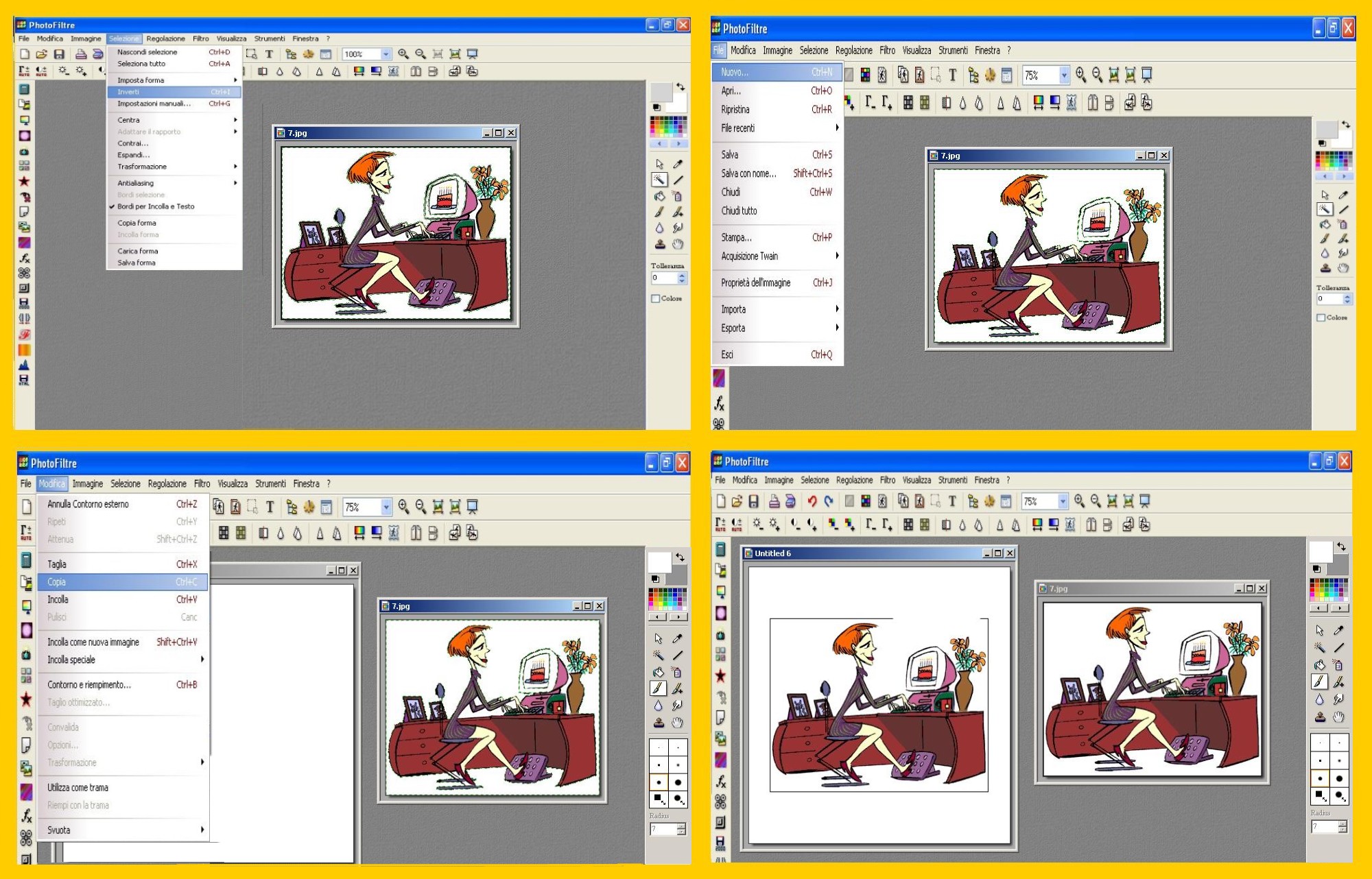 Andiamo al Menù in Alto clicchiamo su Selezione – Inverti (Selection – Invert)… Dovrebbe venire selezionato solo il contorno della nostra segretaria ma come vedrete seleziona sempre una parte del contorno… Era per questo motivo che non ci veniva la trasparenza cliccando sull’icona… La gif ha una linea di contorno nera tutt’attorno che dovremo togliere…. Per toglierla ci conviene incollare la nostra immagine su un documento più grande per vedere meglio la riga attorno. Ingrandiamo, cliccando sulla lente d’ingrandimento 2 o 3 volte minimo, mettiamo il colore dello sfondo nel Menù dei Colori, nel nostro caso bianco, e col pennello passiamo sopra la riga facendola diventare del colore dello sfondo, cioè praticamente cancellandola.