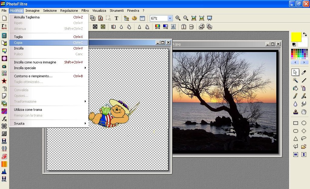 Se invece volessimo solo rendere trasparente lo sfondo dell’immagine, la incolleremo su un documento nuovo con uno sfondo colorato con qualsiasi colore purche non ce ne sia uno uguale nella nostra immagine. Poi cliccheremo sull’ Icona di Trasparenza in alto e così renderemo lo sfondo trasparente.