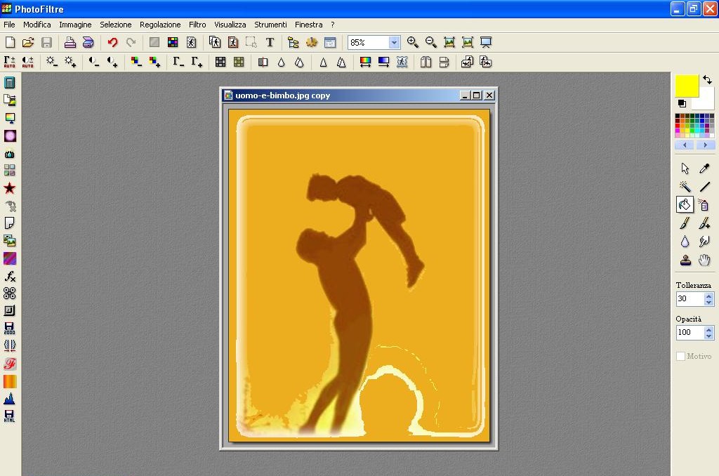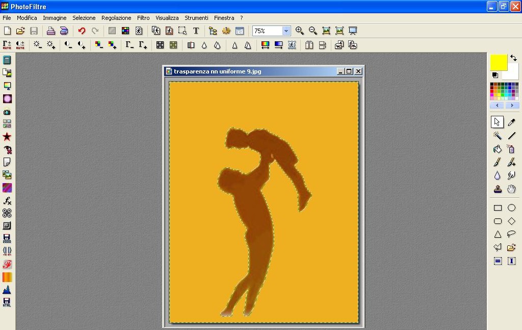 Ora potete provare se volete con l’ Icona di Trasparenza ma ci troviamo come prima…! Certe parti della nostra immagine diventano trasparenti come lo sfondo, per cui non ci rimane altra scelta che provare come se non avesse lo sfondo in colore uniforme come spiegato più sotto in “Sfondi con colore non uniforme”.