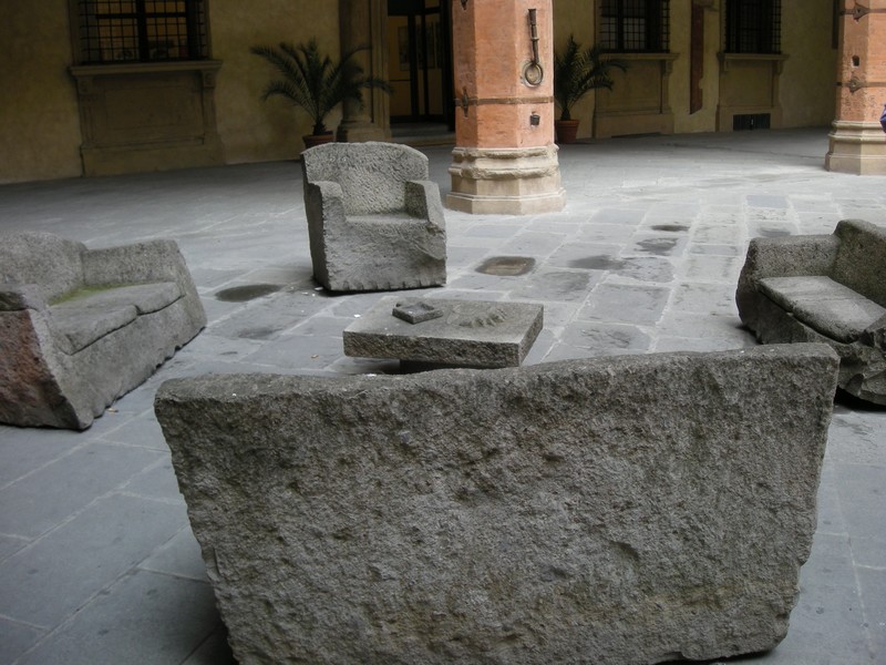 Qualche giro ancora ma poi la stanchezza si fa sentire e camminare al sole diventa man mano più faticoso… Sosta nel dehor di un bel bar a Piazza Maggiore, nei tavolini sotto i portici perché il sole entra ma c’è meno vento… ma ops…hai visto che nuvola nera? E subito inizia a piovere… anche questa volta il mio ombrellino, pesantissimo, è rimasto chiuso in fondo allo zaino…e noi che guardavamo la pioggia tranquillamente sedute all’asciutto 😀 Ma poco dopo di nuovo il sole che ci scalda davanti ai nostri ennesimi tea al limone e caffè… Perché si, stanche come ormai eravamo, abbiamo deciso di trascorrere una giornata diversa…E cercare di battere un record, quello di ore sedute in posti diversi… Dopo ore in treno Luna ed io in macchina, la sosta al ristorante, e due soste nel dehor chissà se avremmo trovato la forza di trovare altri posti per sederci ? 😀 Peccato non aver approfittato a provare quel bel salottino in pietra nel cortile del comune, ma era, sembra, un opera d’arte 🙂 …