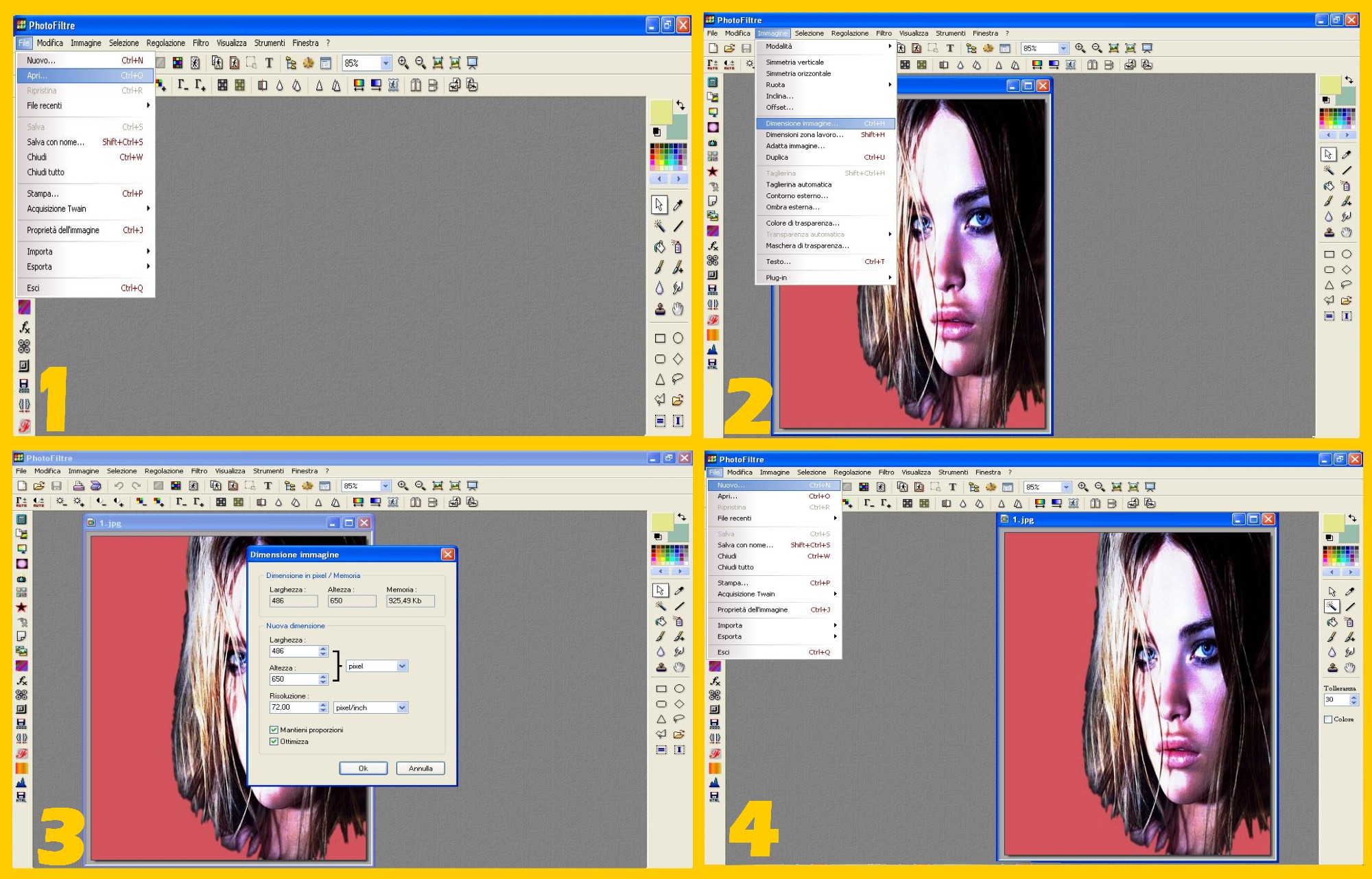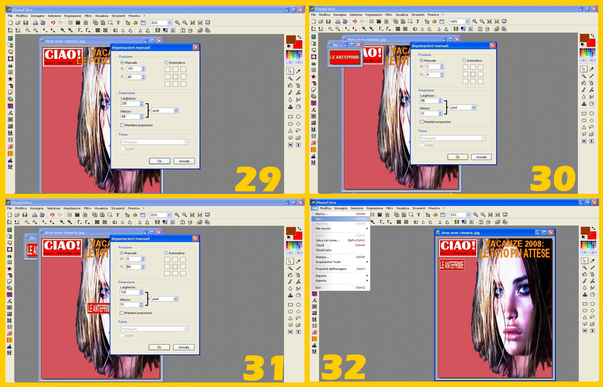 Continuerete ora con la prima foto che volete mettere a sinistra per cui l’aprirete in Photofiltre: File – Apri (FILE – OPEN) (imm.32)