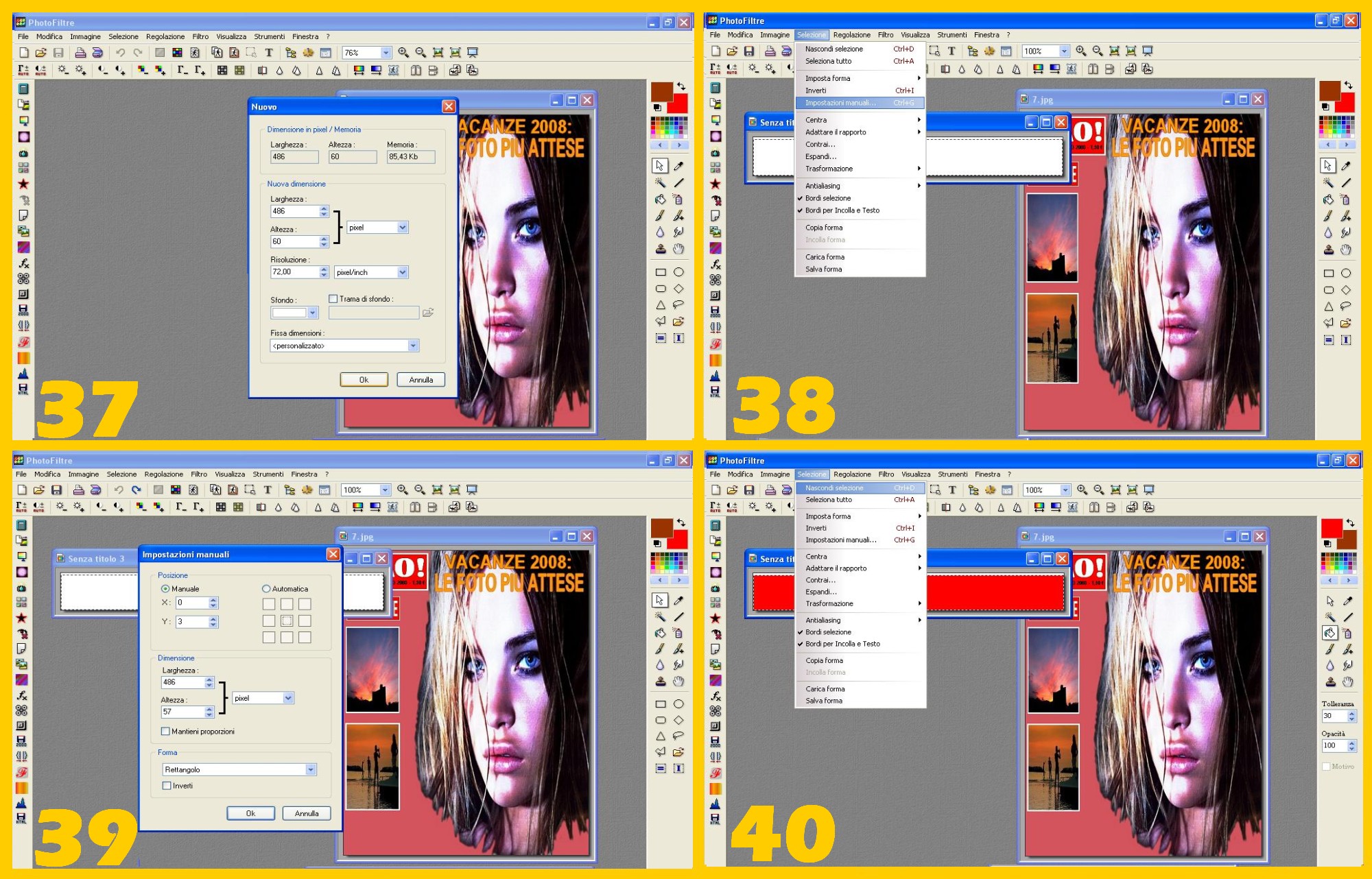 Ormai, per finire la vostra rivista non vi rimane che la striscia con i titoli sotto che, seguendo le altre scritte fatte, potrete fare facilmente. Procedete come prima, punto 4 con 486 di larghezza e 60 di altezza (imm.37).