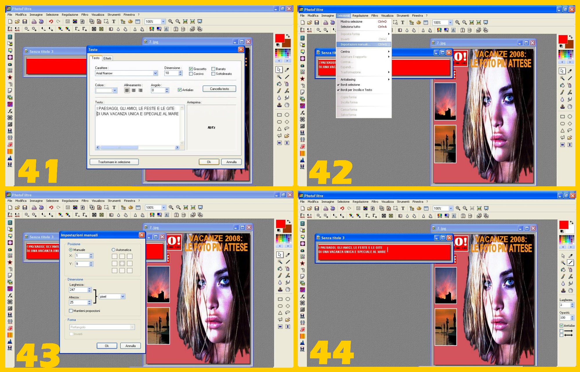 Procedete con la vostra prima scritta (I PAESAGGI, GLI AMICI, LE FESTE E LE GITE DI UNA VACANZA UNICA E SPECIALE AL MARE) cliccando sulla T del Menù in Alto. Carattere Arial Narrow, dimensione 10, Colore bianco e scriverete la frase in due righe come nell’immagine confermando con Ok (imm.41).