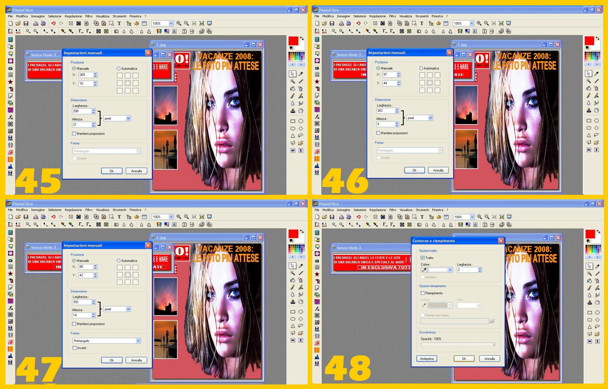 Continuiamo ora con la parte a destra della scritta (BEN QUINDICI GIORNI DI SOLE E MARE). Procedete come nei punti 40 e 41 con la differenza che scrivete su una sola riga ed i valori delle Impostazioni Manuali saranno: “x”= 269, “y” = 10, larghezza = 208 ed altezza = 21 (imm.45).