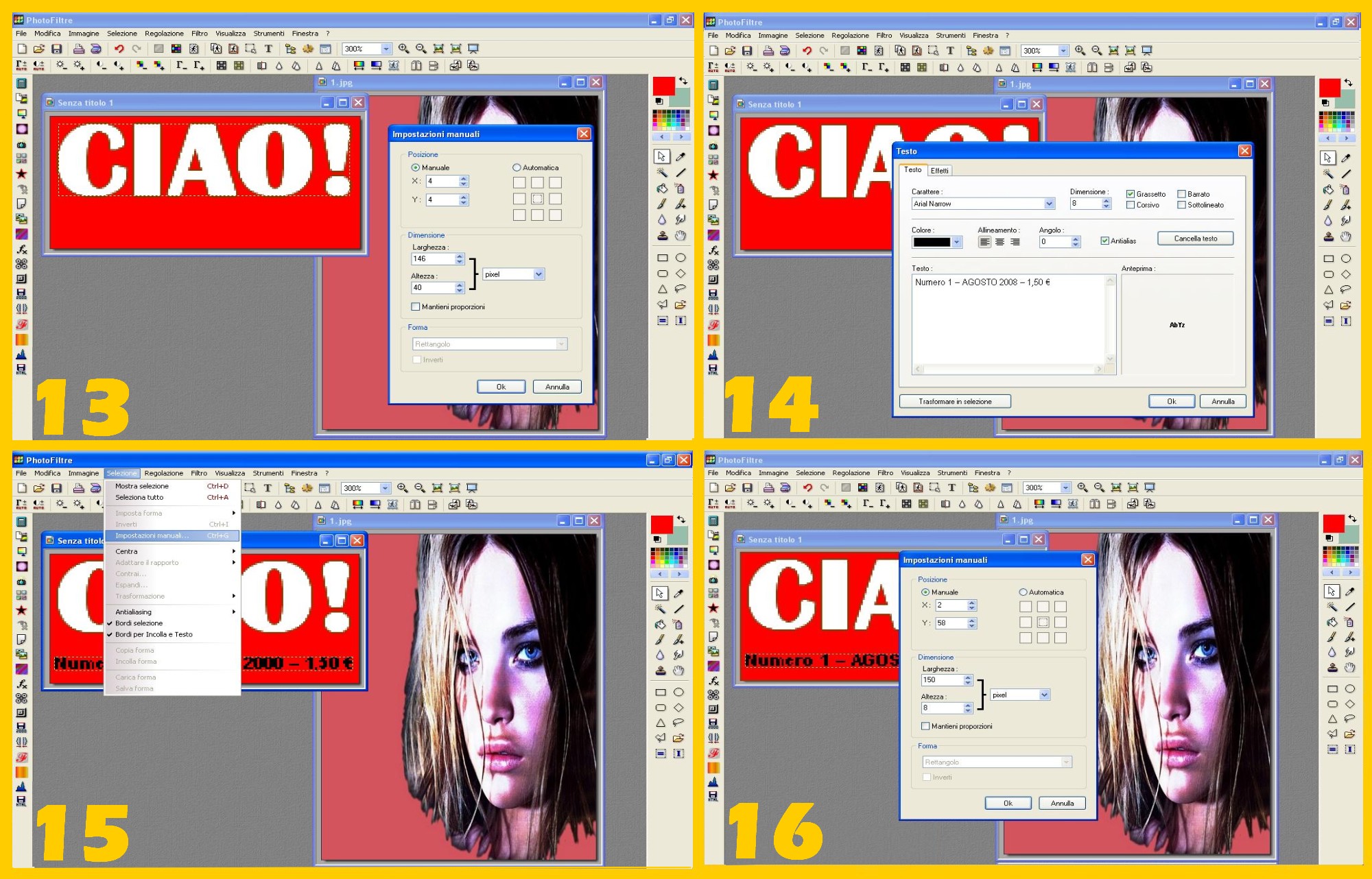 - Clicchiamo di nuovo sulla T per scrivere ora il Testo in Nero sotto CIAO!. Mettiamo un carattere stretto, per esempio Arial Narrow, dimensione 8, Colore nero e scriviamo il nostro testo (Numero 1 – AGOSTO 2008 – 1,50 €) (imm.14). Controllate prima di confermare con Ok che non vi sia rimasto selezionto Tratto (STROKE) negli Effetti (cliccate in alto per vedere nella finestra successiva e deselezionatelo).